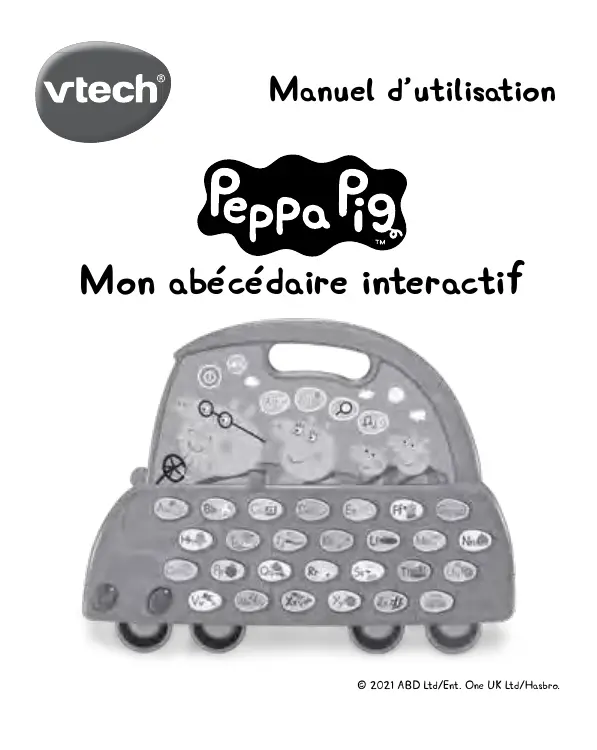 Manuel d’ utilisation Mon abécédaire interactif © 2021 ABD Ltd/Ent. One UK Ltd/Hasbro. INTRODUCTION Vous venez d’ acquérir Mon abécédaire interactif de VTech®. Félicitations ! Votre enfant apprend l’ alphabet tout en s’ amusant avec Peppa et sa famille ! Il découvre des sons, des mots, et le nom des objets correspondant à chaque lettre de l’ alphabet. En forme de voiture, cet abécédaire évoque aussi des notions de sécurité routière. Grâce à la poignée, il est facilement transportable. C’ est parti pour des heures de jeu !