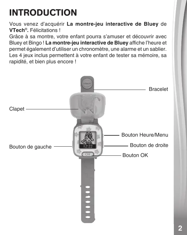 Manuel d’utilisation La montre-jeu interactive BLUEY TM and BLUEY character logos TM & © Ludo Studio Pty Ltd 2018. Licensed by BBC Studios. BBC logo TM & © BBC 1996 INTRODUCTION Vous venez d’acquérir La montre-jeu interactive de Bluey de VTech®. Félicitations ! Grâce à sa montre, votre enfant pourra s’amuser et découvrir avec Bluey et Bingo ! La montre-jeu interactive de Bluey affiche l’heure et permet également d’utiliser un chronomètre, une alarme et un sablier. Les 4 jeux inclus permettent à votre enfant de tester sa mémoire, sa rapidité, et bien plus encore ! Bracelet Clapet Bouton Heure/Menu Bouton de gauche Bouton de droite Bouton OK