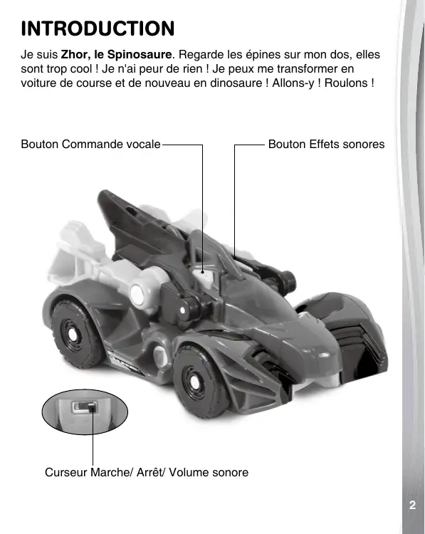 91-003644-002 FR INTRODUCTION Je suis Zhor, le Spinosaure. Regarde les épines sur mon dos, elles sont trop cool ! Je n'ai peur de rien ! Je peux me transformer en voiture de course et de nouveau en dinosaure ! Allons-y ! Roulons ! Bouton Commande vocale Bouton Effets sonores Curseur Marche/ Arrêt/ Volume sonore