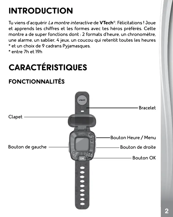 INTRODUCTION Tu viens d’acquérir La montre interactive de VTech®. Félicitations ! Joue et apprends les chiffres et les formes avec tes héros préférés. Cette montre a de super fonctions dont : 2 formats d’heure, un chronomètre, une alarme, un sablier, 4 jeux, un coucou qui retentit toutes les heures