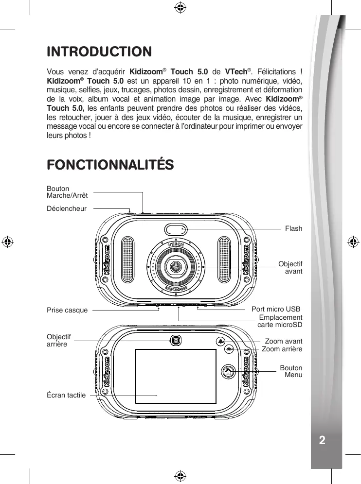 91-003523-001 FR INTRODUCTION Vous venez d’acquérir Kidizoom® Touch 5.0 de VTech®. Félicitations ! Kidizoom® Touch 5.0 est un appareil 10 en 1 : photo numérique, vidéo, musique, selfies, jeux, trucages, photos dessin, enregistrement et déformation de la voix, album vocal et animation image par image. Avec Kidizoom® Touch 5.0, les enfants peuvent prendre des photos ou réaliser des vidéos, les retoucher, jouer à des jeux vidéo, écouter de la musique, enregistrer un message vocal ou encore se connecter à l’ordinateur pour imprimer ou envoyer leurs photos ! FONCTIONNALITÉS Bouton Marche/Arrêt Déclencheur Flash Objectif avant Prise casque Objectif arrière Port micro USB Emplacement carte microSD Zoom avant Zoom arrière Bouton Menu Écran tactile