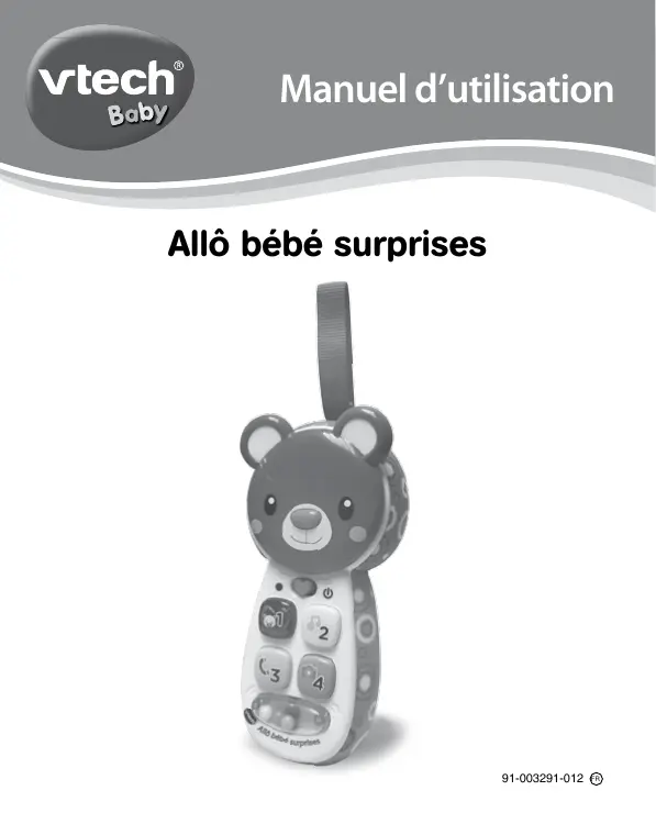Vou venez d'acquerir Allô bébé surprises de VTech®. Félicitations! Ce téléphone amusant incitera votre enfant à parler! Il appuie sur les 4 boutons pour apprendre les chiffres, les couleurs et déclencher des phrases. Il pourrait tourner la tête d'ours pour découvert un miroir et jouer à coucou-caché!