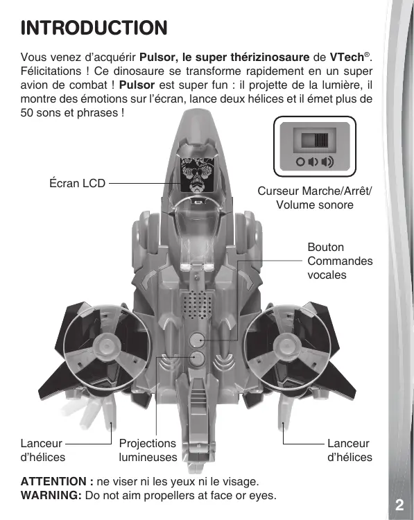 Eriz inosau super Th Pulsor, le INTRODUCTION Vous venez d’acquérir Pulsor, le super thérizinosaure de VTech®. Félicitations ! Ce dinosaure se transforme rapidement en un super avion de combat ! Pulsor est super fun : il projette de la lumière, il montre des émotions sur l’écran, lance deux hélices et il émet plus de 50 sons et phrases ! Écran LCD Curseur Marche/Arrêt/ Volume sonore Bouton Commandes vocales Lanceur d’hélices Projections lumineuses ATTENTION : ne viser ni les yeux ni le visage.
