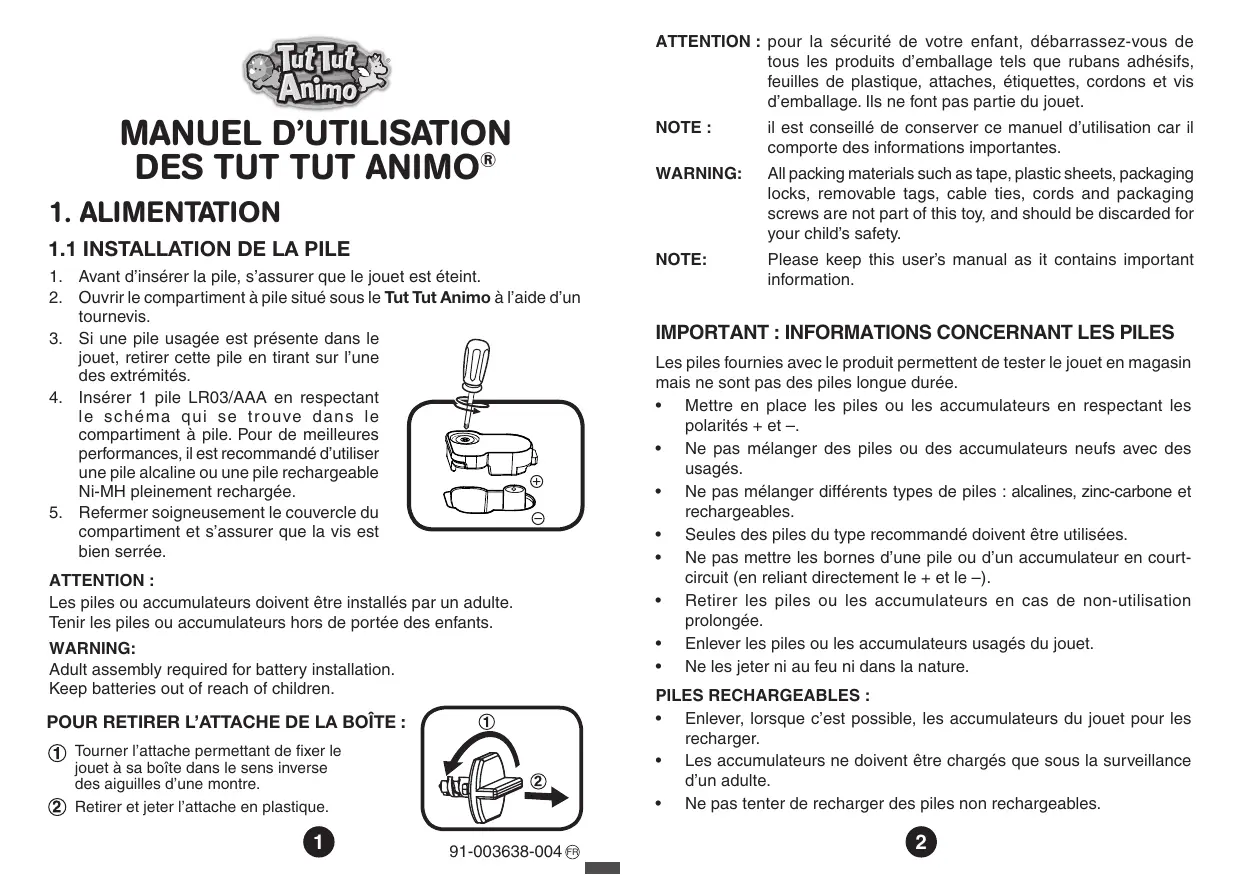- Ne pas tenter de recharger des piles non rechargeables. POUR RETIRER L’ATTACHE DE LA BOÎTE : Tourner l’attache permettant de fixer le jouet à sa boîte dans le sens inverse des aiguilles d’une montre. Retirer et jeter l’attache en plastique.