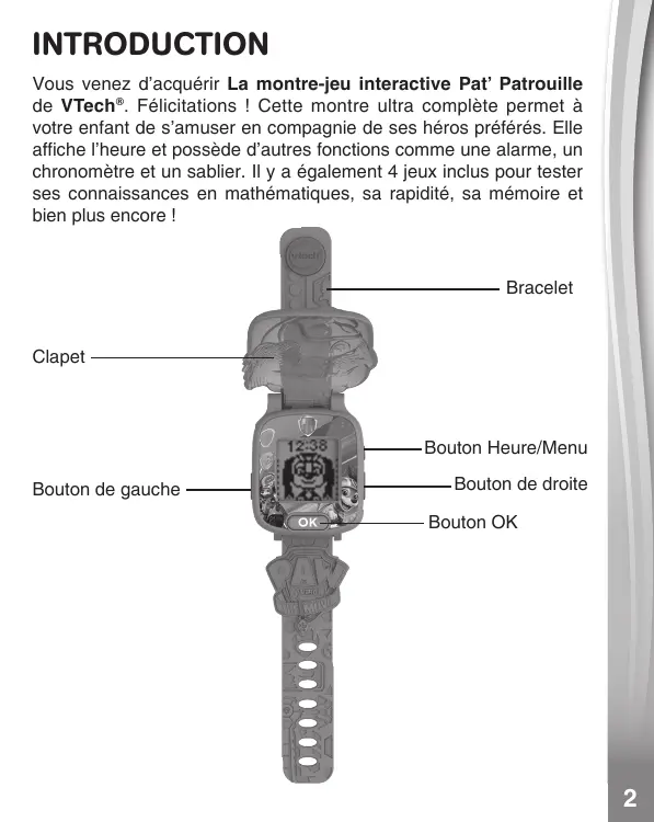 INTRODUCTION Vous venez d’acquérir La montre-jeu interactive Pat’ Patrouille de VTech®. Félicitations ! Cette montre ultra complète permet à votre enfant de s’amuser en compagnie de ses héros préférés. Elle affiche l’heure et possède d’autres fonctions comme une alarme, un chronomètre et un sablier. Il y a également 4 jeux inclus pour tester ses connaissances en mathématiques, sa rapidité, sa mémoire et bien plus encore ! Bracelet Clapet Bouton Heure/Menu Bouton de gauche Bouton de droite Bouton OK