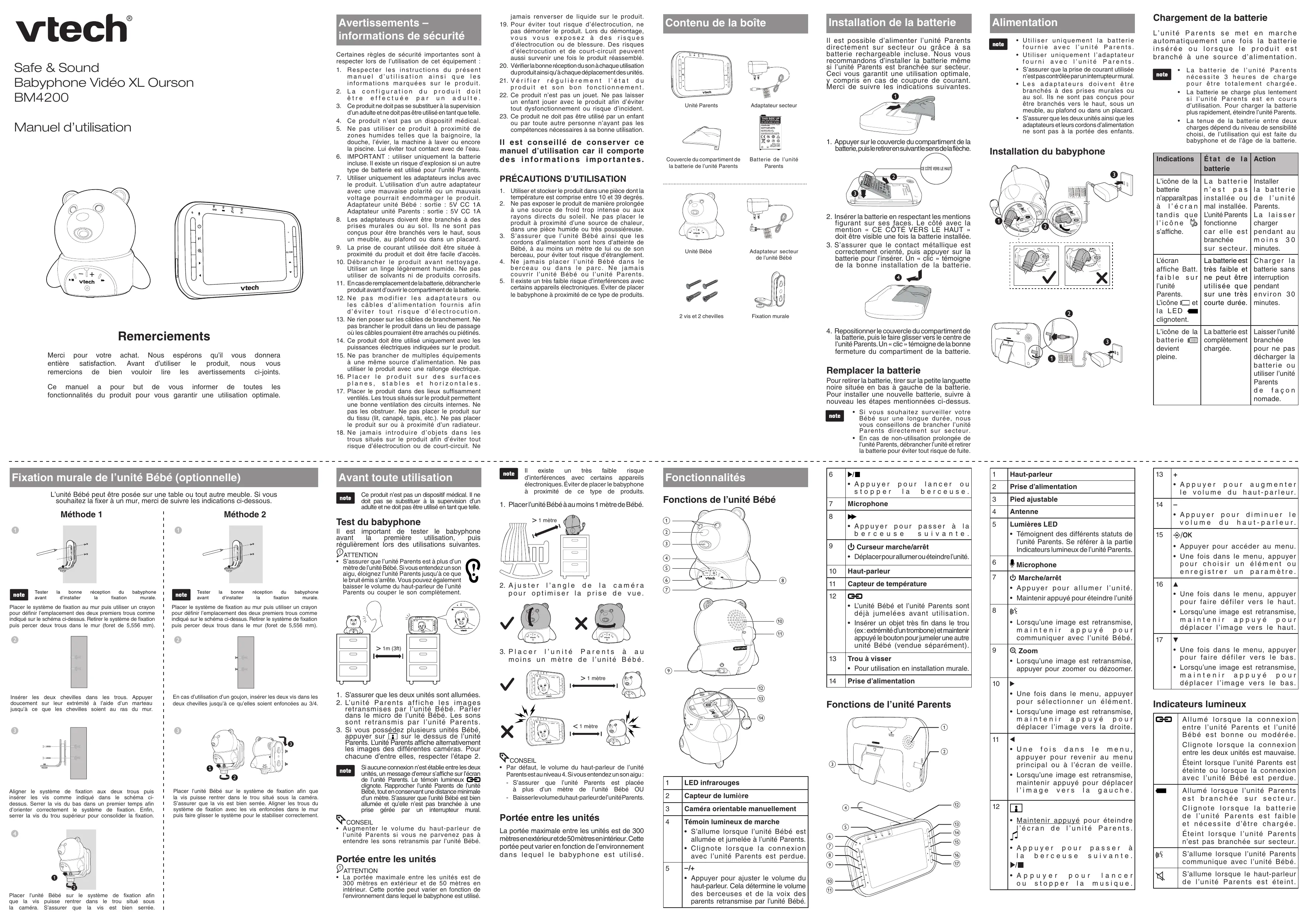 Ecran Écran LCD couleur de 4.3 ” (WQVGA 480x272 pixel) Portée La portée peut varier en f o n c t i o n d e l ’e n v i r o n n e m e n t dans lequel le produit est utilisé. Alimentation Batterie de l’unité Parents : Batterie Lithium, 3.7 V, 950 mAH BYD SCD530-4 Adaptateur de l’unité Bébé : EU: Tenpao S006AKV0500100 Entrée : 100-240V CA, 50/60Hz, 200mA Sortie : 5V CC, 1000mA Adaptateur de l’unité Parents : EU: Tenpao S006MV0500100 Entrée : 100-240 V CA, 50/60 Hz, 300mA Sortie : 5V CC, 1000 mA La prise de courant utilisée doit être située à proximité du produit e t d o i t ê t r e f a c i l e d ’a c c è s . L e s p r o d u i t s V Te c h s o n t d e s équipements électriques et électroniques (EEE) qui, en fin de vie, feront l’objet d’une collecte sélective en vue de leur recyclage. Ainsi, afin de préserver l’environnement, VTech vo u s re c o m m a n d e d e ret irer et de jeter vos piles et batteries usagées dans les containers prévus à cet effet, puis de déposer le produit en fin de vie dans les points de collecte mis à votre disposition dans les magasins ou dans votre commune. Le symbole de la poubelle barrée sur les produits et les piles ou sur leur emballage respectif indique que les équipements électriques et électroniques ainsi que les piles et les batteries ne doivent pas être jetés dans les déchets ménagers car ils contiennent des substances pouvant être néfastes à l’environnement et la santé. Lorsque les symboles Hg, Cd ou Pb sont indiqués, cela signifie que la pile ou la batterie contient plus de mercure (Hg), cadmium (Cd) ou plomb (Pb) que la valeur spécifiée d ans la D ire c t ive ( 20 0 6 / 6 6 / CE ) sur les piles et les accumulateurs. La barre solide sous le symbole de la poubelle barrée indique que le produit a été placé sur le mar c hé a près l e 13 aoû t 20 0 5. Contribuez à la protection d e l ’e n v i r o n n e m e n t e n t r i a n t vos produits et piles usagés. Déclaration de conformité Ce produit est destiné à être utilisé en Europe. Cet équipement est conforme aux dispositions de la Directive du Conseil 1999/5/CE sur l’équipement par radio et l’équipement terminal de télécommunications. Nous, VTech, déclarons que le Babyphone Vidéo XL Ourson (BM4200) est conforme aux spécifications essentiellesetautresdispositionsdelaDirective1999/5/CE. Une copie de la déclaration de conformité est disponible sur le site : http://www.vtech.com/rtte-directive Dans le souci constant d’améliorer la qualité de nos produits, nous pouvons être amenés à en modifier certaines caractéristiques sans avis préalable. Photos non contractuelles. VTech. Tous droits réservés. VTech Safe & Sound est une marque déposée.