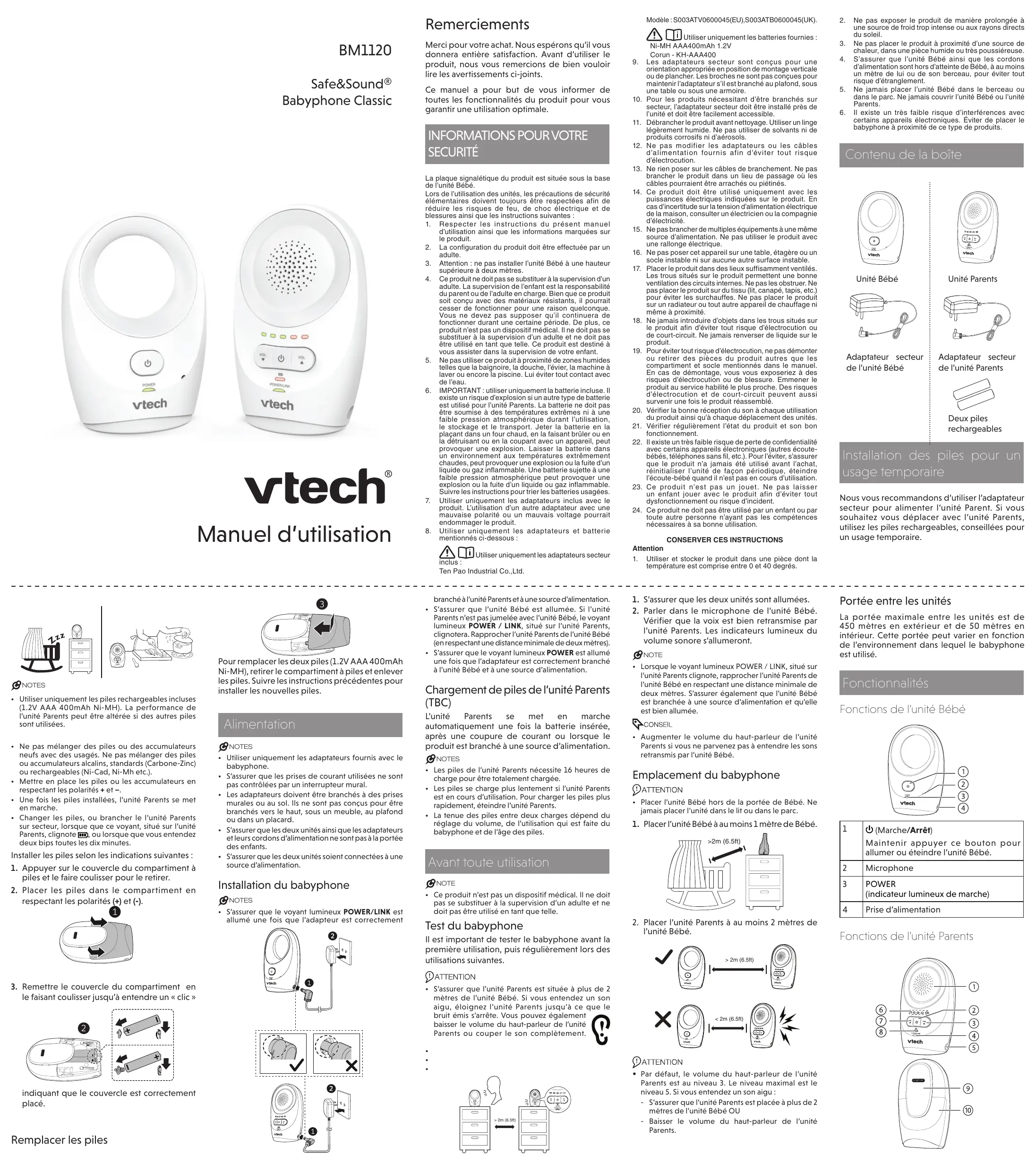Retrouvez gratuitement la notice de l'appareil Babyphone Classic BM1120 - Ecoute-bébé audio VTECH au format PDF.