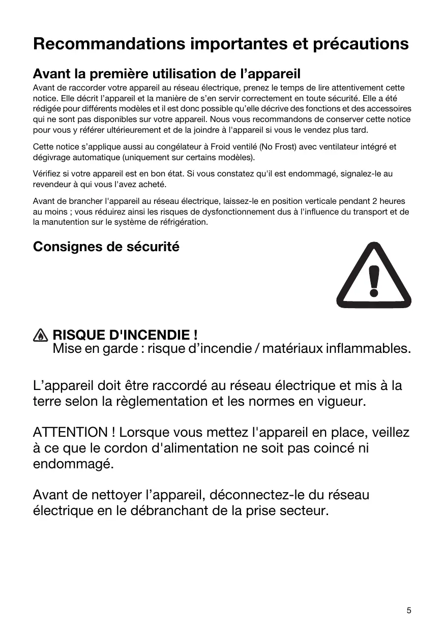 RISQUE D'INCENDIE ! Mise en garde : risque d’incendie / matériaux inflammables. L’appareil doit être raccordé au réseau électrique et mis à la terre selon la règlementation et les normes en vigueur. ATTENTION ! Lorsque vous mettez l'appareil en place, veillez à ce que le cordon d'alimentation ne soit pas coincé ni endommagé. Avant de nettoyer l’appareil, déconnectez-le du réseau électrique en le débranchant de la prise secteur.