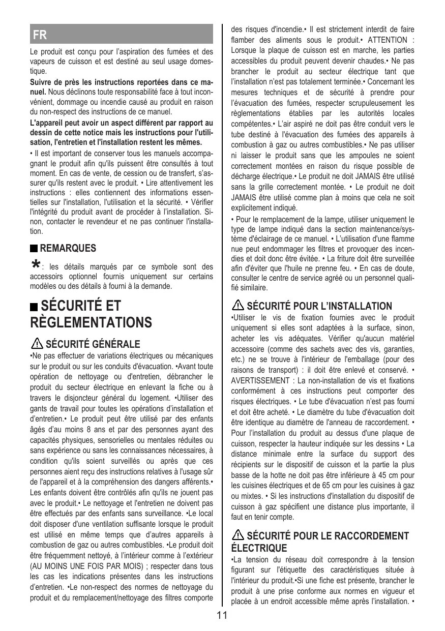 FR Le produit est conçu pour l’aspiration des fumées et des vapeurs de cuisson et est destiné au seul usage domestique. Suivre de près les instructions reportées dans ce manuel. Nous déclinons toute responsabilité face à tout inconvénient, dommage ou incendie causé au produit en raison du non-respect des instructions de ce manuel. L'appareil peut avoir un aspect différent par rapport au dessin de cette notice mais les instructions pour l'utilisation, l'entretien et l'installation restent les mêmes. • Il est important de conserver tous les manuels accompagnant le produit afin qu'ils puissent être consultés à tout moment. En cas de vente, de cession ou de transfert, s’assurer qu'ils restent avec le produit. • Lire attentivement les instructions : elles contiennent des informations essentielles sur l'installation, l'utilisation et la sécurité. • Vérifier l'intégrité du produit avant de procéder à l’installation. Sinon, contacter le revendeur et ne pas continuer l'installation.