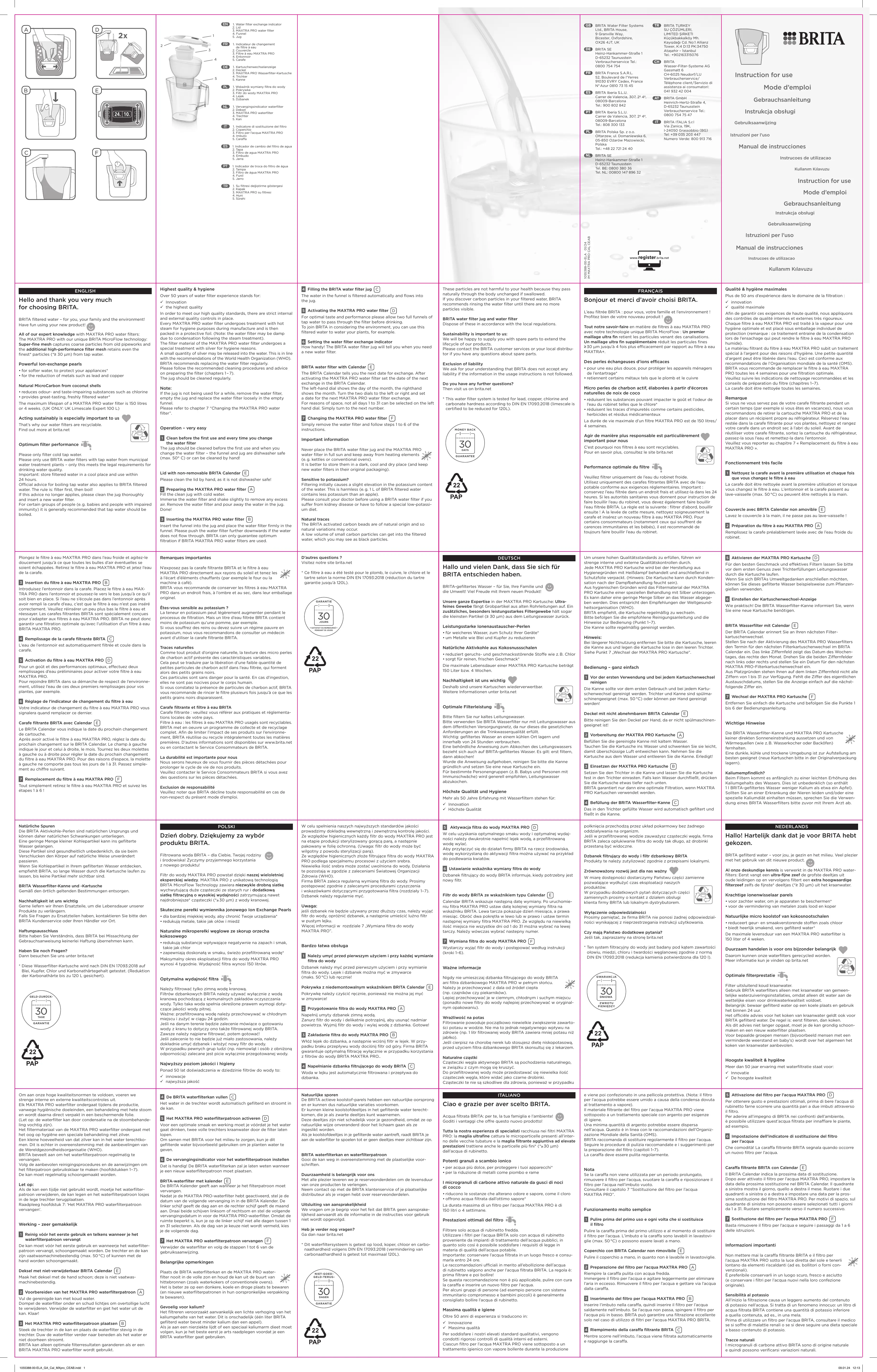 GUARANTEE PAP FRANÇAIS Bonjour et merci d’avoir choisi BRITA. L'eau filtrée BRITA : pour vous, votre famille et l'environnement ! Profitez bien de votre nouveau produit ! Tout notre savoir-faire en matière de filtres à eau MAXTRA PRO avec notre technologie unique BRITA MicroFlow : Un premier maillage ultra fin retient les particules venant des canalisations. Un maillage ultra fin supplémentaire réduit les particules fines 230 lim jusqu'à 4 fois plus efficacement par rapport au filtre à eau MAXTRA+. Des perles échangeuses d'ions efficaces + pour une eau plus douce, pour protéger les appareils ménagers de l'entartrage* + retiennent certains métaux tels que le plomb et le cuivre Micro perles de charbon actif, élaborées à partir d’écorces naturelles de noix de coco + réduisent les substances pouvant impacter le goût et l'odeur de l'eau du robinet telles que le chlore* + réduisent les traces d'impuretés comme certains pesticides, herbicides et résidus médicamenteux La durée de vie maximale d'un filtre MAXTRA PRO est de 150 litres/ 4 semaines. Agir de manière plus responsable est particulièrement important pour nous C'est pourquoi nos filtres à eau sont recyclables. Pour en savoir plus, consultez le site brita.net Performance optimale du filtre Veuillez filtrer uniquement de l'eau du robinet froide. Utilisez uniquement des carafes filtrantes BRITA avec de l'eau potable conforme aux exigences réglementaires. Important conservez l'eau filtrée dans un endroit frais et utilisez-la dans les 24 heures. Si les autorités sanitaires vous donnent pour instruction de faire bouillir l'eau du robinet, vous devez également faire bouillir l'eau filtrée BRITA. La règle est la suivante : filtrer d'abord, bouillir ensuite ! À la levée de cette mesure, nettoyez soigneusement la carafe et insérez un nouveau filtre à eau MAXTRA PRO. Pour certains consommateurs (notamment ceux qui souffrent de carences immunitaires et les bébés), il est recommandé de toujours faire bouillir l'eau du robinet Qualité & hygiène maximales Plus de 50 ans d'expérience dans le domaine de la filtration : Y_ innovation qualité maximale Afin de garantir ces exigences de haute qualité, nous appliquons des contrôles de qualité internes et externes très rigoureux. Chaque filtre à eau MAXTRA PRO est traité à la vapeur pour une hygiène optimale et est placé sous emballage individuel de protection (remarque : ce traitement entraine de la condensation lors de l'ensachage qui peut rendre le filtre à eau MAXTRA PRO humide) Le matériau filtrant du filtre à eau MAXTRA PRO subit un traitement spécial à l'argent pour des raisons d'hygiène. Une petite quantité d'argent peut être libérée dans l'eau. Ceci est conforme aux recommandations de l'Organisation mondiale de la santé (OMS). BRITA vous recommande de remplacer le filtre à eau MAXTRA PRO toutes les 4 semaines pour une filtration optimale. Veuillez suivre les indications de nettoyage recommandées et les conseils de préparation du filtre (chapitres 1-7) La carafe doit être nettoyée toutes les semaines. Remarque Si vous ne vous servez pas de votre carafe filtrante pendant un certain temps (par exemple si vous êtes en vacances), nous vous recommandons de retirer la cartouche MAXTRA PRO et de la placer dans un récipient propre au réfrigérateur. Réservez l'eau restée dans la carafe filtrante pour vos plantes, nettoyez et rangez votre carafe dans un endroit sec à l'abri du soleil. Avant de réutiliser votre carafe filtrante, sortez la cartouche du réfrigérateur, passez-la sous l’eau et remettez-la dans l'entonnoir. Veuillez vous reporter au chapitre 7 « Remplacement du filtre à eau MAXTRA PRO ». Fonctionnement très facile El Nettoyez la carafe avant la première utilisation et chaque fois que vous changez le filtre à eau La carafe doit être nettoyée avant la première utilisation et lorsque vous changez le filtre à eau. L'entonnoir et la carafe passent au lave-vaisselle (max. 50 °C) ou peuvent être nettoyés à la main. Couvercle avec BRITA Calendar non amovible (E) Lavez le couvercle à la main, il ne passe pas au lave-vaisselle ! E Préparation du filtre à eau MAXTRA PRO Remplissez la carafe préalablement lavée avec de l'eau froide du robinet. Plongez le filtre à eau MAXTRA PRO dans l'eau froide et agitez-le doucement jusqu'à ce que toutes les bulles d'air éventuelles se soient échappées. Retirez le filtre à eau MAXTRA PRO et jetez l'eau de la carafe. El insertion du filtre à eau MAXTRA PRO introduisez l'entonnoir dans la carafe. Placez le filtre à eau MAX- TRA PRO dans l'entonnoir et poussez-le vers le bas jusqu'à ce qu'il soit bien en place. Si l'eau ne s'écoule pas dans l'entonnoir après avoir rempli la carafe d'eau, c'est que le filtre à eau n'est pas inséré correctement. Veuillez réinsérer un peu plus bas le filtre à eau et réessayer. Les carafes filtrantes BRITA sont spécialement conçues pour s'adapter aux filtres à eau MAXTRA PRO. BRITA ne peut donc garantir une filtration optimale qu'avec l'utilisation d'un filtre à eau BRITA MAXTRA PRO. El Remplissage de la carafe filtrante BRITA L'eau de l'entonnoir est automatiquement filtrée et coule dans la carafe. El Activation du filtre à eau MAXTRA PRO (D) Pour un goût et des performances optimaux, effectuez deux remplissages d'eau préliminaires pour activer votre filtre à eau MAXTRA PRO. Pour rejoindre BRITA dans sa démarche de respect de l'environne- ment, utilisez l'eau de ces deux premiers remplissages pour vos plantes, par exemple. H Régiage de l'indicateur de changement du filtre à eau Votre indicateur de changement du filtre à eau MAXTRA PRO vous signalera quand remplacer ce dernier. Carafe filtrante BRITA avec Calendar Le BRITA Calendar vous indique la date du prochain changement de cartouche. Après avoir activé le filtre à eau MAXTRA PRO, réglez la date du prochain changement sur le BRITA Calendar. Le champ à gauche in
