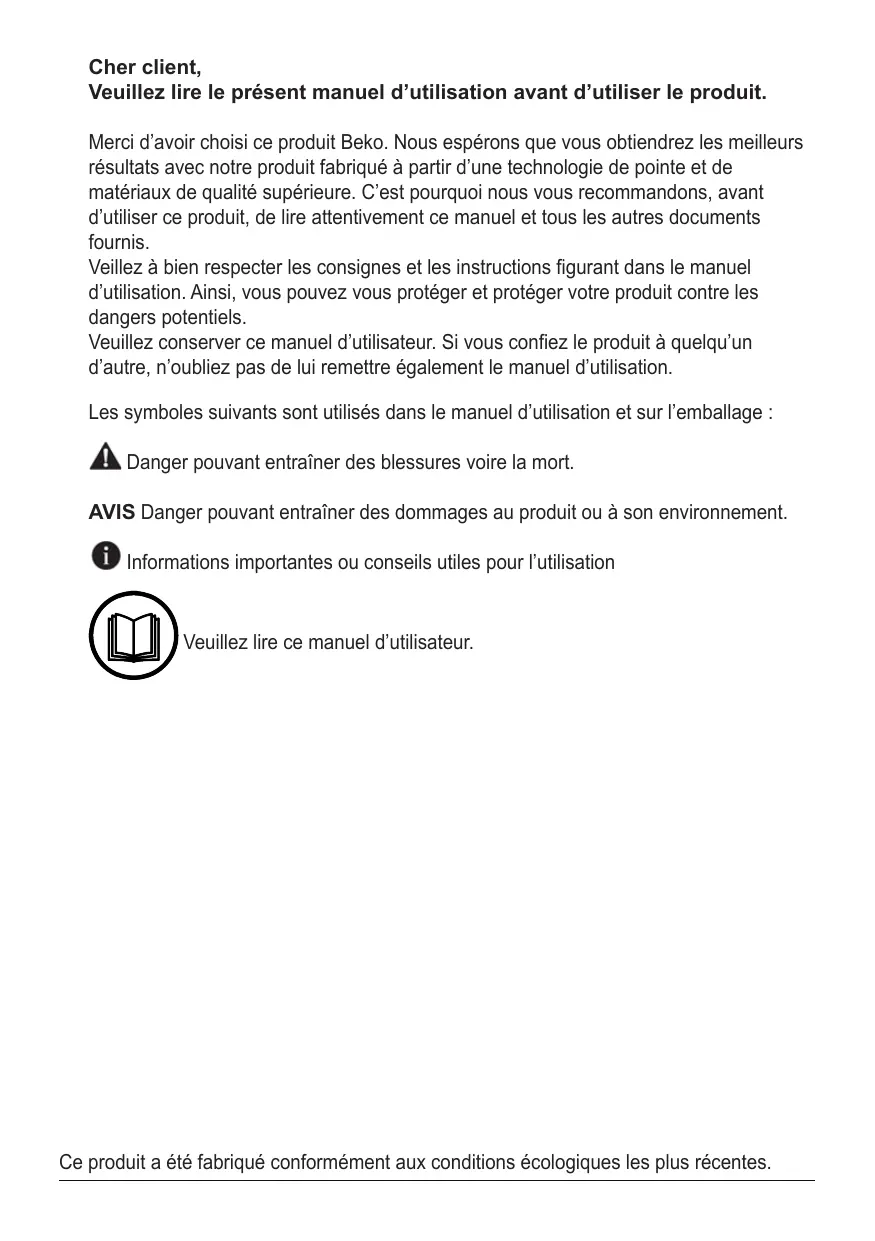 Cher client, Veuillez lire le présent manuel d'utilisation avant d’utiliser le produit. Merci d’avoir choisi ce produit Beko. Nous espérons que vous obtiendrez les meilleurs résultats avec notre produit fabriqué à partir d’une technologie de pointe et de matériaux de qualité supérieure. C'est pourquoi nous vous recommandons, avant d'utiliser ce produit, de lire attentivement ce manuel et tous les autres documents fournis. Veillez à bien respecter les consignes et les instructions figurant dans le manuel d'utilisation. Ainsi, vous pouvez vous protéger et protéger votre produit contre les dangers potentiels. Veuillez conserver ce manuel d'utilisateur. Si vous confiez le produit à quelqu'un d'autre, n'oubliez pas de lui remettre également le manuel d'utilisation. Les symboles suivants sont utilisés dans le manuel d'utilisation et sur l'emballage : À Danger pouvant entraîner des blessures voire la mort. AVIS Danger pouvant entraîner des dommages au produit ou à son environnement. li] Informations importantes ou conseils utiles pour l’utilisation Veuillez lire ce manuel d'utilisateur. Ce produit a été fabriqué conformément aux conditions écologiques les plus récentes.