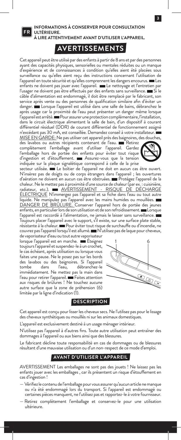 DESCRIPTION Cet appareil est conçu pour lisser les cheveux secs. Ne l'utilisez pas pour le lissage des cheveux synthétiques ou mouillés ni sur les animaux domestiques.
