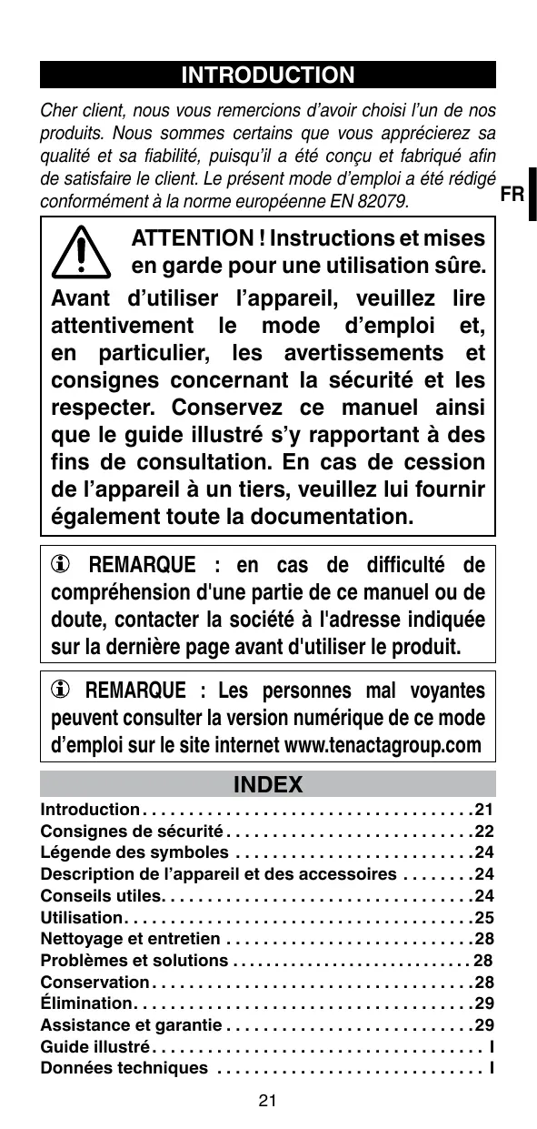 INDEX Introduction Consignes de sécurité. Légende des symboles Description de l’appareil et des accessoires . Conseils utiles. Utilisation. ..…. Nettoyage et entretien . Problèmes et solutions Conservation. Élimination. Assistance et garantie . Guide illustré Données techniques ..