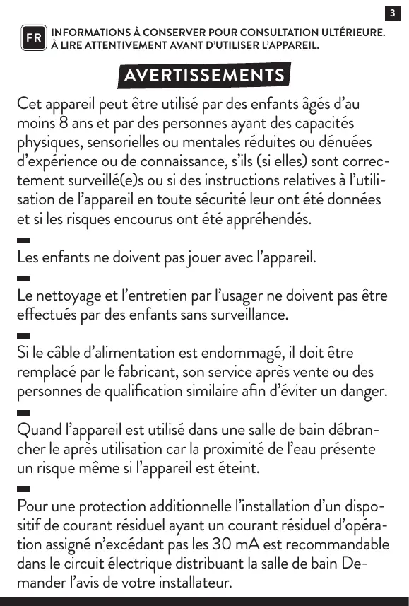 ÉLECTRIQUE N'immergez pas l'appareil et sa fiche dans Peau ou tout autre liquide. Ne manipulez pas l'appareil avec les mains humides ou mouillées.