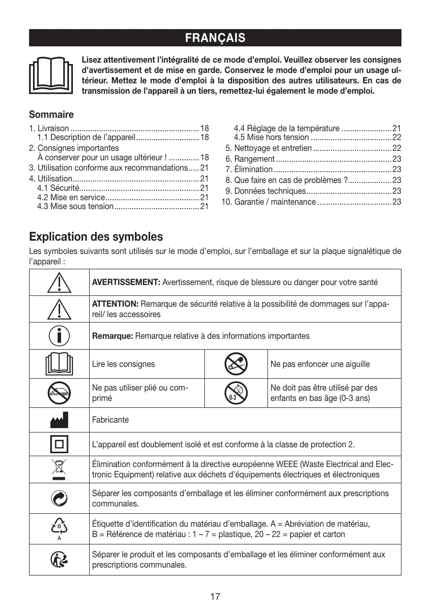 + Ce chauffe-matelas peut être utilisé par les enfants à partir de 8 ans ainsi que les déficients physiques, sensoriels ou mentaux et les per- sonnes ayant peu de connaissances ou d'expérience à la condition qu'ils soient surveillés ou sachent comment l'utiliser en toute sécurité et en comprennent les risques.