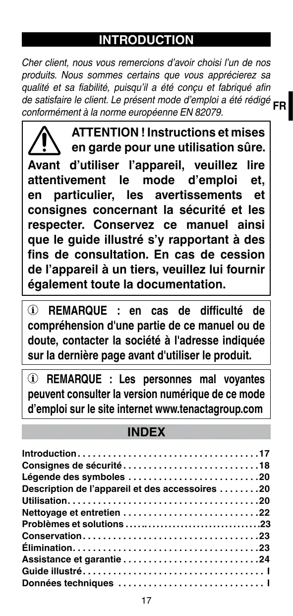 Utilisation Nettoyage et entretien . Problèmes et solutions Conservation. Élimination. Assistance et garantie . Guide illustré et qu’il ne présente aucun signe de dommage.