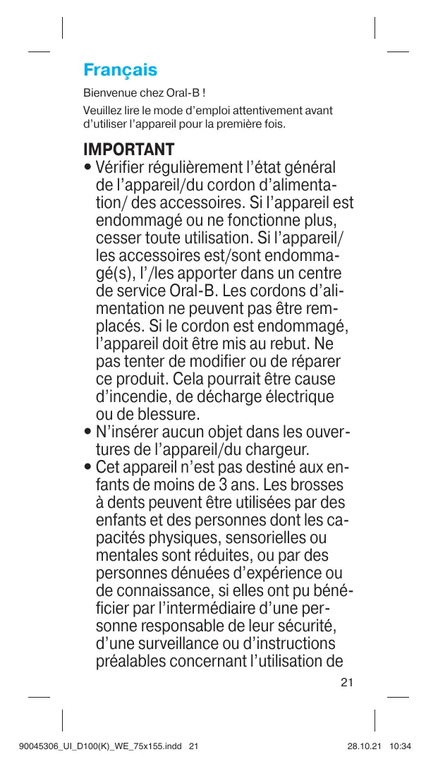 Cet appareil n’est pas destiné aux en- fants de moins de 3 ans. Les brosses à dents peuvent être utilisées par des enfants et des personnes dont les ca- pacités physiques, sensorielles ou mentales sont réduites, ou par des personnes dénuées d'expérience ou de connaissance, si elles ont pu béné- ficier par l'intermédiaire d’une per- sonne responsable de leur sécurité, d’une surveillance ou d'instructions préalables concernant l’utilisation de 21
