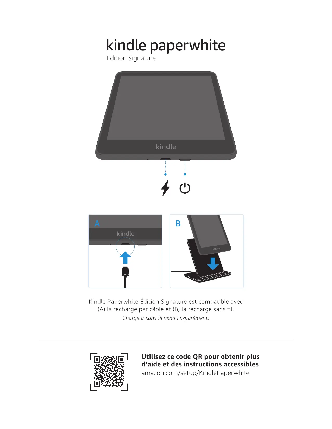 Kindle Paperwhite Édition Signature est compatible avec (A) la recharge par câble et (B) la recharge sans fil. Chargeur sans fil vendu séparément. Utilisez ce code QR pour obtenir plus d'aide et des instructions accessibles amazon.com/setup/KindlePaperwhite