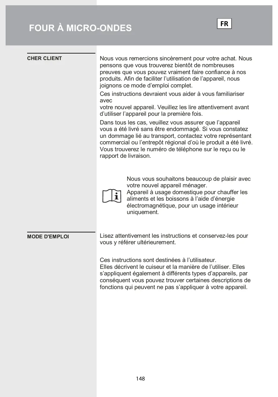 FOUR À MICRO-ONDES CHER CLIENT MODE D'EMPLOI Nous vous remercions sincèrement pour votre achat. Nous pensons que vous trouverez bientôt de nombreuses preuves que vous pouvez vraiment faire confiance à nos produits. Afin de faciliter l’utilisation de l'appareil, nous joignons ce mode d'emploi complet.