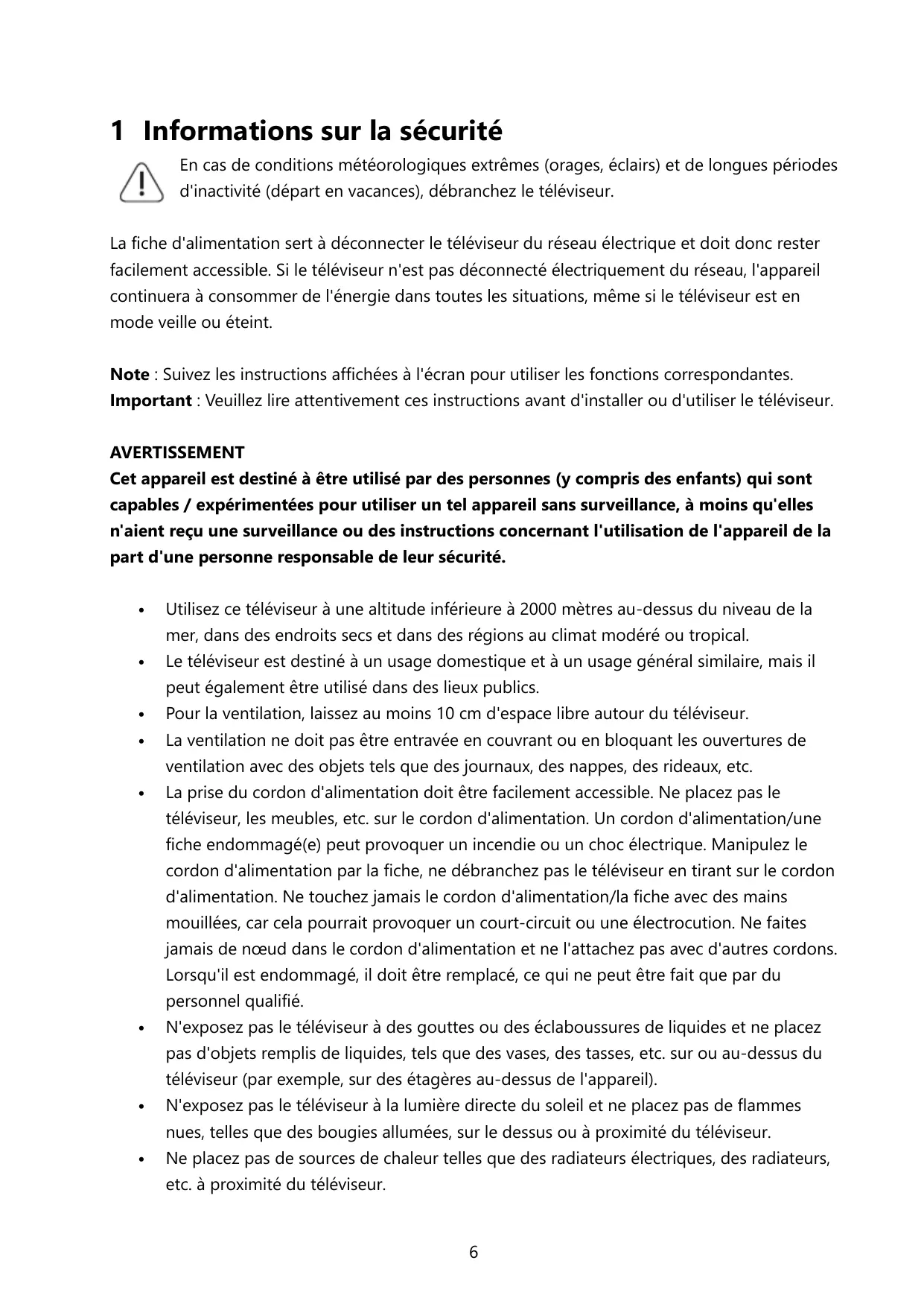 1 Informations sur la sécurité En cas de conditions météorologiques extrêmes (orages, éclairs) et de longues périodes d'inactivité (départ en vacances), débranchez le téléviseur. La fiche d'alimentation sert à déconnecter le téléviseur du réseau électrique et doit donc rester facilement accessible. Si le téléviseur n'est pas déconnecté électriquement du réseau, l'appareil continuera à consommer de l'énergie dans toutes les situations, même si le téléviseur est en mode veille où éteint. Note : Suivez les instructions affichées à l'écran pour utiliser les fonctions correspondantes. Important : Veuillez lire attentivement ces instructions avant d'installer ou d'utiliser le téléviseur. AVERTISSEMENT Cet appareil est destiné à être uti capables / expérimentées pour utiliser un tel appareil sans surveillance, à moins qu'elles é par des personnes (y compris des enfants) qui sont n'aient reçu une surveillance ou des instructions concernant l'utilisation de l'appareil de la part d'une personne responsable de leur sécurité. + Utilisez ce téléviseur à une altitude inférieure à 2000 mètres au-dessus du niveau de la mer, dans des endroits secs et dans des régions au climat modéré ou tropical. + __Le téléviseur est destiné à un usage domestique et à un usage général similaire, mais il peut également être utilisé dans des lieux publics. + __ Pour la ventilation, laissez au moins 10 cm d'espace libre autour du téléviseur. + La ventilation ne doit pas être entravée en couvrant où en bloquant les ouvertures de ventilation avec des objets tels que des journaux, des nappes, des rideaux, etc. + La prise du cordon d'alimentation doit être facilement accessible. Ne placez pas le téléviseur, les meubles, etc. sur le cordon d'alimentation. Un cordon d'alimentation/une fiche endommagé(e) peut provoquer un incendie ou un choc électrique. Manipulez le cordon d'alimentation par la fiche, ne débranchez pas le téléviseur en tirant sur le cordon d'alimentation. Ne touchez jamais le cordon d'alimentation/la fiche avec des mains mouillées, car cela pourrait provoquer un court-circuit où une électrocution. Ne faites jamais de nœud dans le cordon d'alimentation et ne l'attachez pas avec d'autres cordons. Lorsqu'il est endommagé, il doit être remplacé, ce qui ne peut être fait que par du personnel qualifié. + N'exposez pas le téléviseur à des gouttes où des éclaboussures de liquides et ne placez pas d'objets remplis de liquides, tels que des vases, des tasses, etc. sur ou au-dessus du téléviseur (par exemple, sur des étagères au-dessus de l'appareil). + N'exposez pas le téléviseur à la lumière directe du soleil et ne placez pas de flammes nues, telles que des bougies allumées, sur le dessus ou à proximité du téléviseur. + __Ne placez pas de sources de chaleur telles que des radiateurs électriques, des radiateurs, etc. à proximité du téléviseur.
