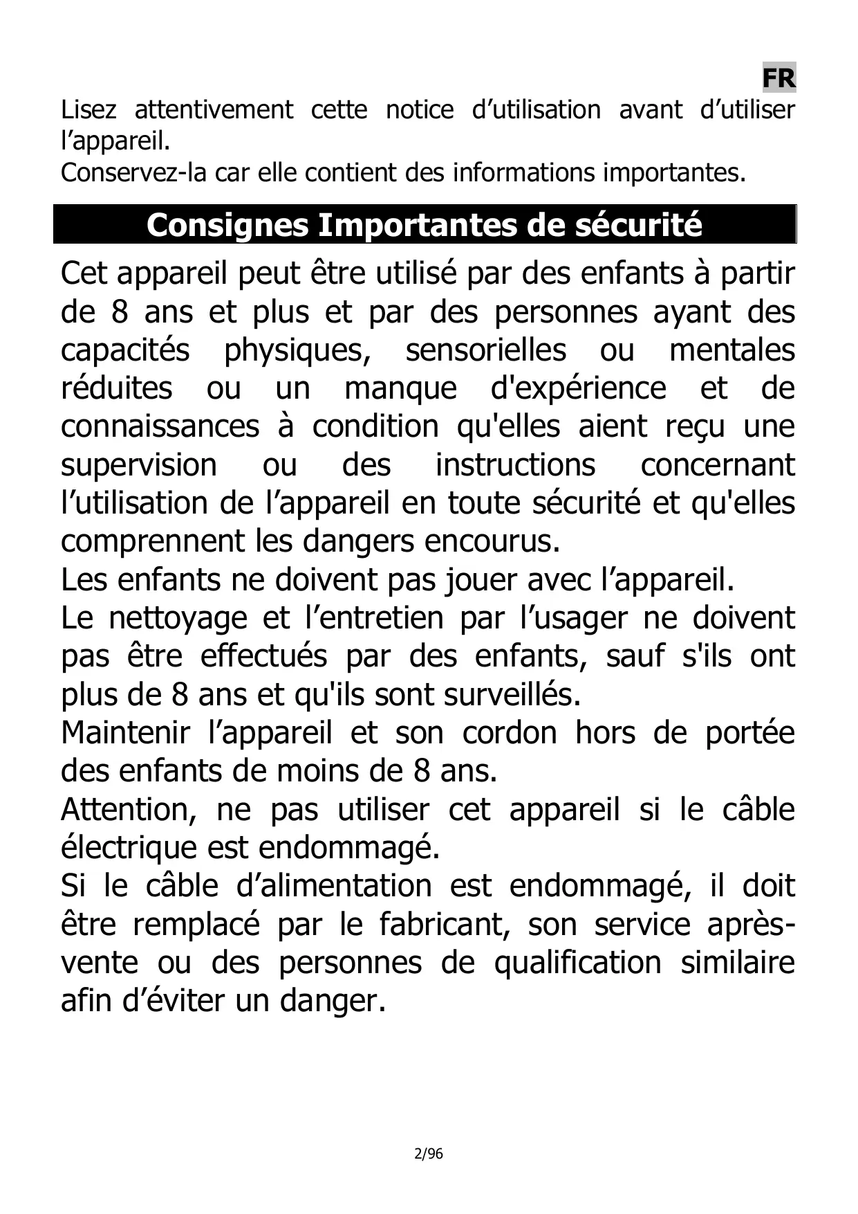 Attention, ne pas utiliser cet apparéil si le cable électrique est endommagé.