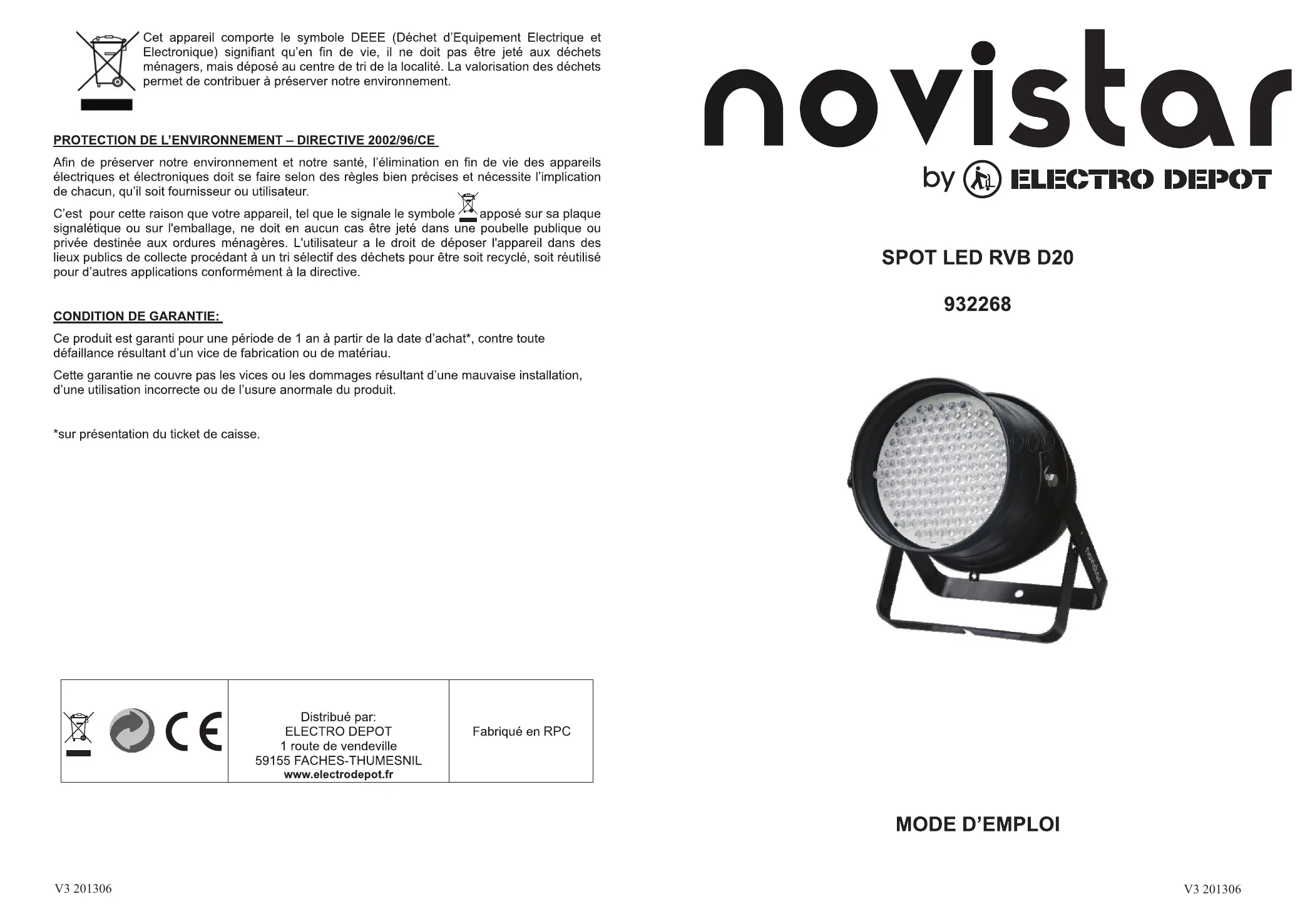 Retrouvez gratuitement la notice de l'appareil PAR 64 SPOT LED RVB D20 NOVISTAR au format PDF.