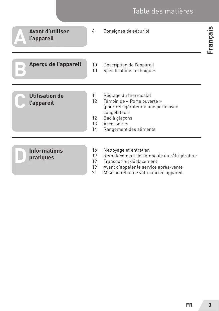 Avant d'utiliser 4 Consignes de sécurité l'appareil Aperçu de l'appareil 10 Description de l'appareil 10 Spécifications techniques Utilisation de 11. Réglage du thermostat l'appareil 12. Témoin de « Porte ouverte » {pour réfrigérateur à une porte avec congélateur) 12 Bac à glaçons 13 Accessoires 14 Rangement des aliments Informations 16 Nettoyage et entretien GTS 19. Remplacement de l'ampoule du réfrigérateur pratiq 19 Transport et déplacement 19 Avant d'appeler le service après-vente 21 Mise au rebut de votre ancien appareil