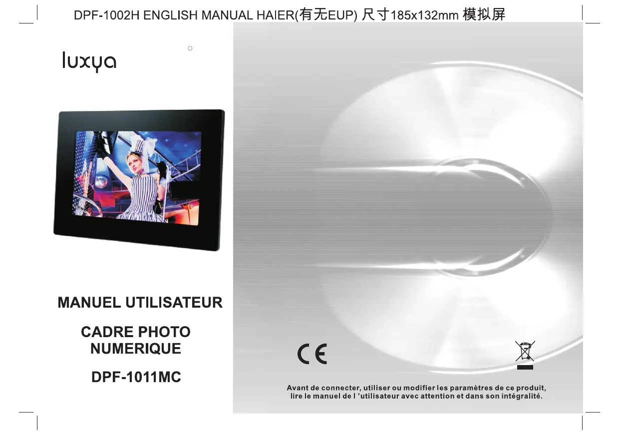 DPF-1002H ENGLISH MANUAL HAIER(E ÆEUP) R Ÿ185x132mm 5 luxya MANUEL UTILISATEUR CADRE PHOTO NUMERIQUE CE x DPF-1011MC = Avant de connecter, utiliser ou modifier les paramètres de ce produit, lire le manuel de | ’utilisateur avec attention et dans son intégralité.