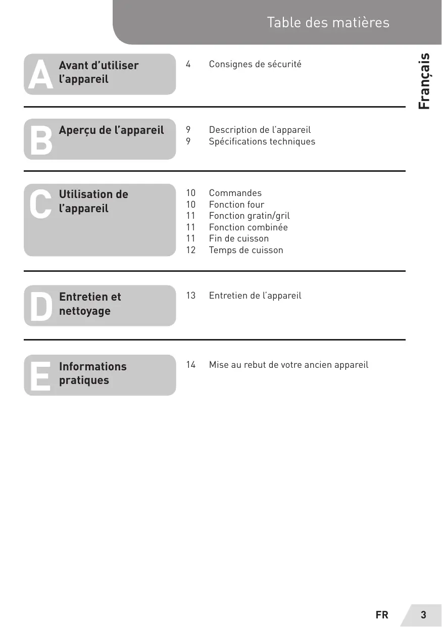 Table des matières Francais Avant d'utiliser 4 Consignes de sécurité l'appareil Aperçu de l'appareil 9 Description de l'appareil 9 Spécifications techniques Utilisation de 10 Commandes ,. 5 10 Fonction four ler 11 Fonction gratin/gril 11 Fonction combinée 11 Fin de cuisson