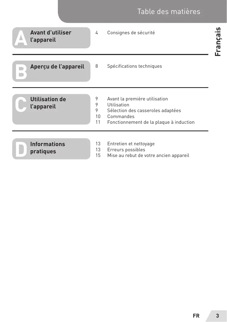 9 Avant la première utilisation 9 Utilisation 9 Sélection des casseroles adaptées 10 Commandes 11 Fonctionnement de la plaque à induction