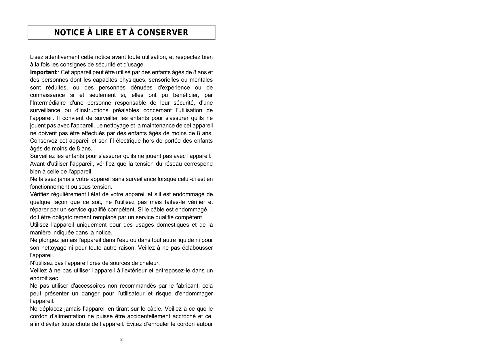 Lisez attentivement cette notice avant toute utilisation, et respectez bien à la fois les consignes de sécurité et d'usage. Important : Cet appareil peut être utilisé par des enfants âgés de 8 ans et des personnes dont les capacités physiques, sensorielles ou mentales sont réduites, ou des personnes dénuées d'expérience ou de connaissance si et seulement si, elles ont pu bénéficier, par l'intermédiaire d'une personne responsable de leur sécurité, d'une surveillance ou d'instructions préalables concernant l'utilisation de l'appareil. Il convient de surveiller les enfants pour s'assurer qu'ils ne jouent pas avec l'appareil. Le nettoyage et la maintenance de cet appareil ne doivent pas être effectués par des enfants âgés de moins de 8 ans. Conservez cet appareil et son fil électrique hors de portée des enfants âgés de moins de 8 ans. Surveillez les enfants pour s'assurer qu'ils ne jouent pas avec l'appareil. Avant d'utiliser l'appareil, vérifiez que la tension du réseau correspond bien à celle de l'appareil. Ne laissez jamais votre appareil sans surveillance lorsque celui-ci est en fonctionnement ou sous tension. Vérifiez régulièrement l’état de votre appareil et s’il est endommagé de quelque façon que ce soit, ne l'utilisez pas mais faites-le vérifier et réparer par un service qualifié compétent. Si le câble est endommagé, il doit être obligatoirement remplacé par un service qualifié compétent. Utilisez l'appareil uniquement pour des usages domestiques et de la manière indiquée dans la notice. Ne plongez jamais l'appareil dans l'eau ou dans tout autre liquide ni pour son nettoyage ni pour toute autre raison. Veillez à ne pas éclabousser l'appareil. N'utilisez pas l'appareil près de sources de chaleur. Veillez à ne pas utiliser l'appareil à l'extérieur et entreposez-le dans un endroit sec. Ne pas utiliser d'accessoires non recommandés par le fabricant, cela peut présenter un danger pour l’utilisateur et risque d'endommager l'appareil. Ne déplacez jamais l'appareil en tirant sur le câble. Veillez à ce que le cordon d'alimentation ne puisse être accidentellement accroché et ce, afin d'éviter toute chute de l'appareil. Evitez d’enrouler le cordon autour