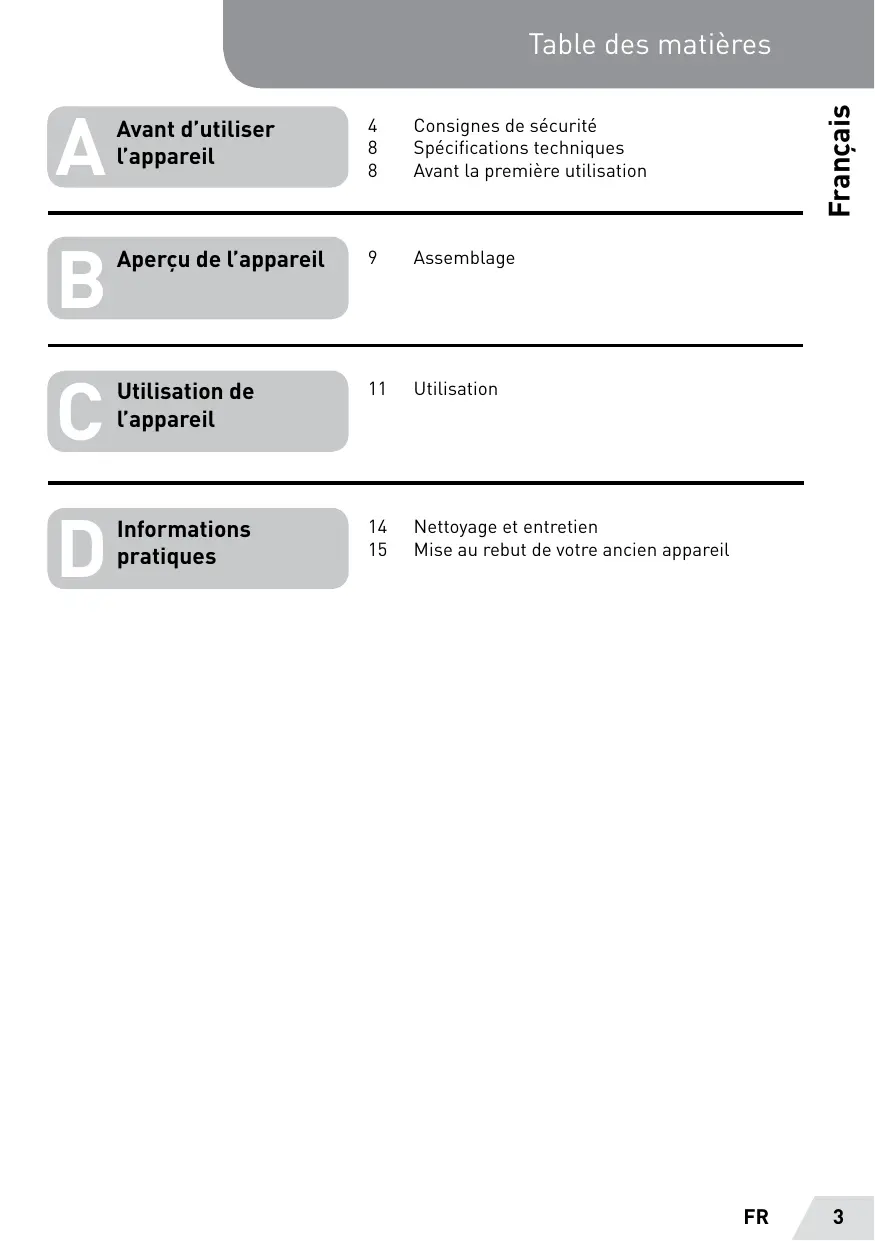 Table des matières Avant d'utiliser 4 Consignes de sécurité D n 8 Spécifications techniques lepreereil 8 Avant La première utilisation Aperçu de l'appareil 7 Assemblage Utilisation de 11. Utilisation l'appareil Informations 14 Nettoyage et entretien pratiques 15 Mise au rebut de votre ancien appareil