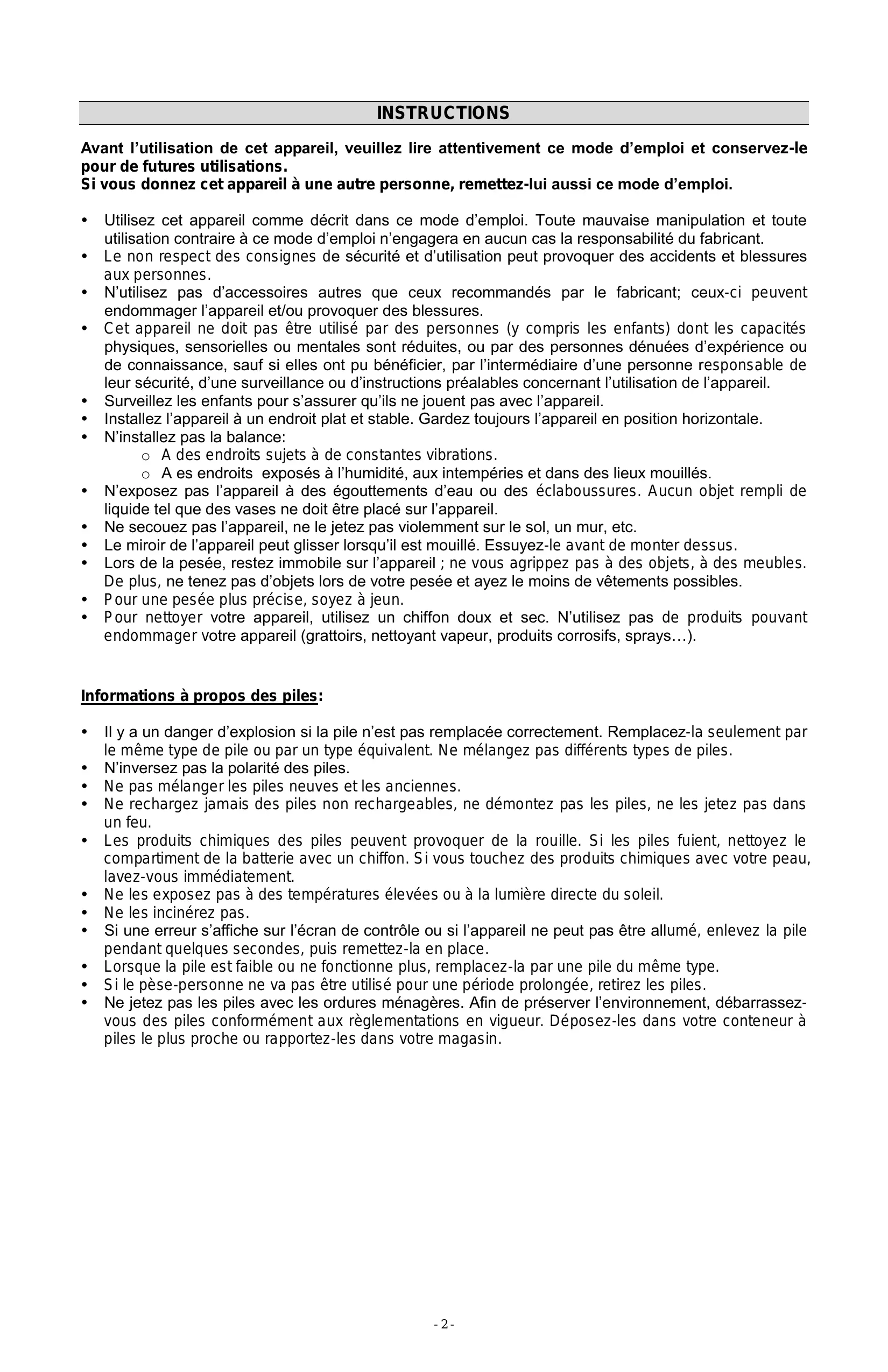 - Ne rechargez jamais des piles non rechargeables, ne demontez pas les piles, ne les jetez pas dans un feu.