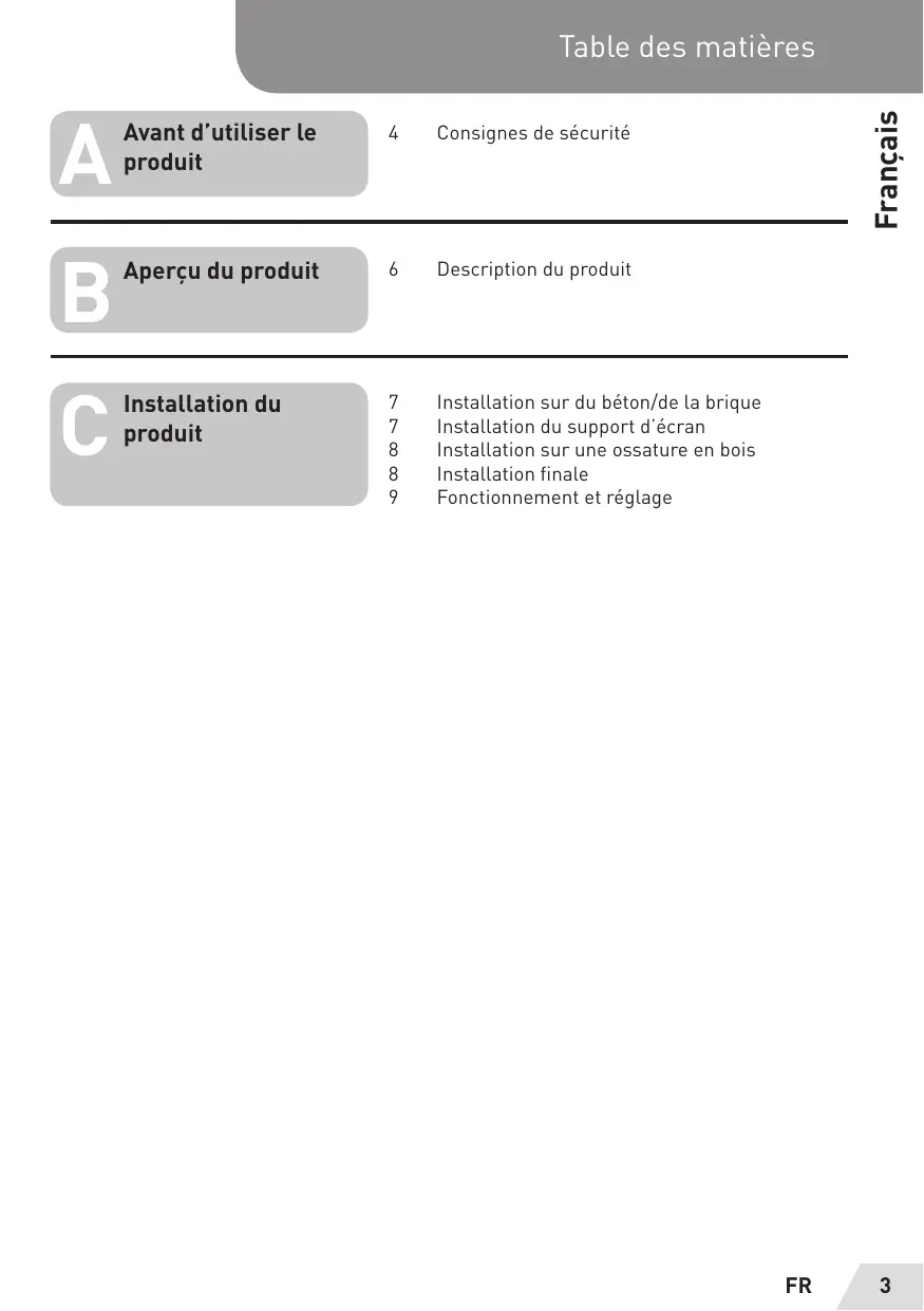 Avant l'installation de ce produit, vous devez dire et comprendre parfaitement les instructions d'installation. Les instructions d'installation doivent être lues attentivement, afin d'éviter les blessures corporelles et les dommages matériels. Conservez ces instructions dans un endroit facilement accessible pour pouvoir les consulter ultérieurement.