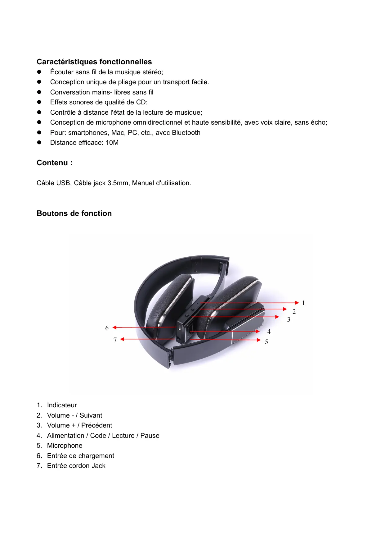 Caractéristiques fonctionnelles Écouter sans fil de la musique stéréo; Conception unique de pliage pour un transport facile. Conversation mains- libres sans fil Effets sonores de qualité de CD; Contrôle à distance l'état de la lecture de musique; Conception de microphone omnidirectionnel et haute sensibilité, avec voix claire, sans écho; Pour: smartphones, Mac, PC, etc., avec Bluetooth Distance efficace: 10M Contenu : Câble USB, Câble jack 3.5mm, Manuel d'utilisation. Boutons de fonction . Indicateur . Volume - / Suivant . Volume + / Précédent . Alimentation / Code / Lecture / Pause . Microphone . Entrée de chargement . Entrée cordon Jack NO 1 B & ND =