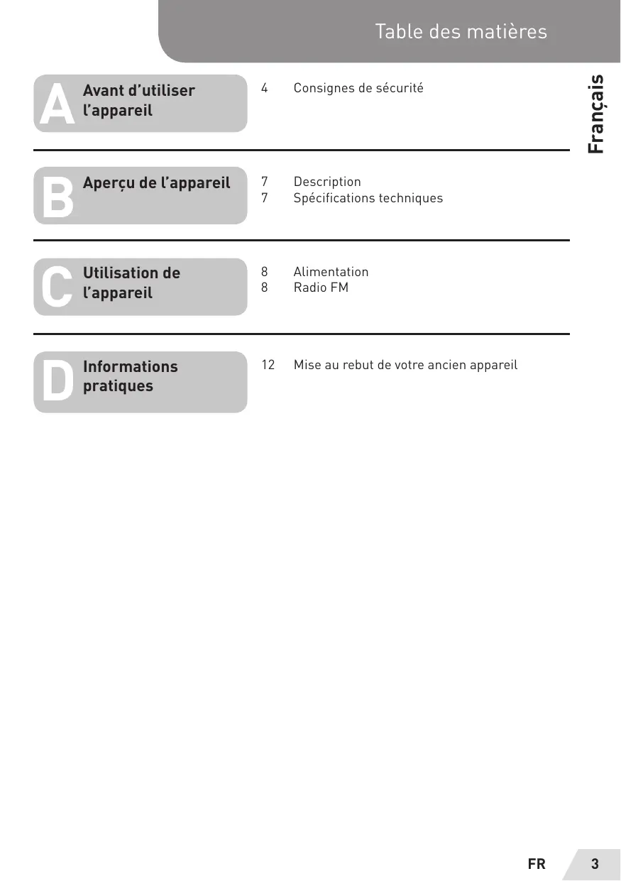 Table des matières Francais A a 7 Description 7 Spécifications techniques 8 Alimentation 8 Radio FM ee 12 Mise au rebut de votre ancien appareil FR 3