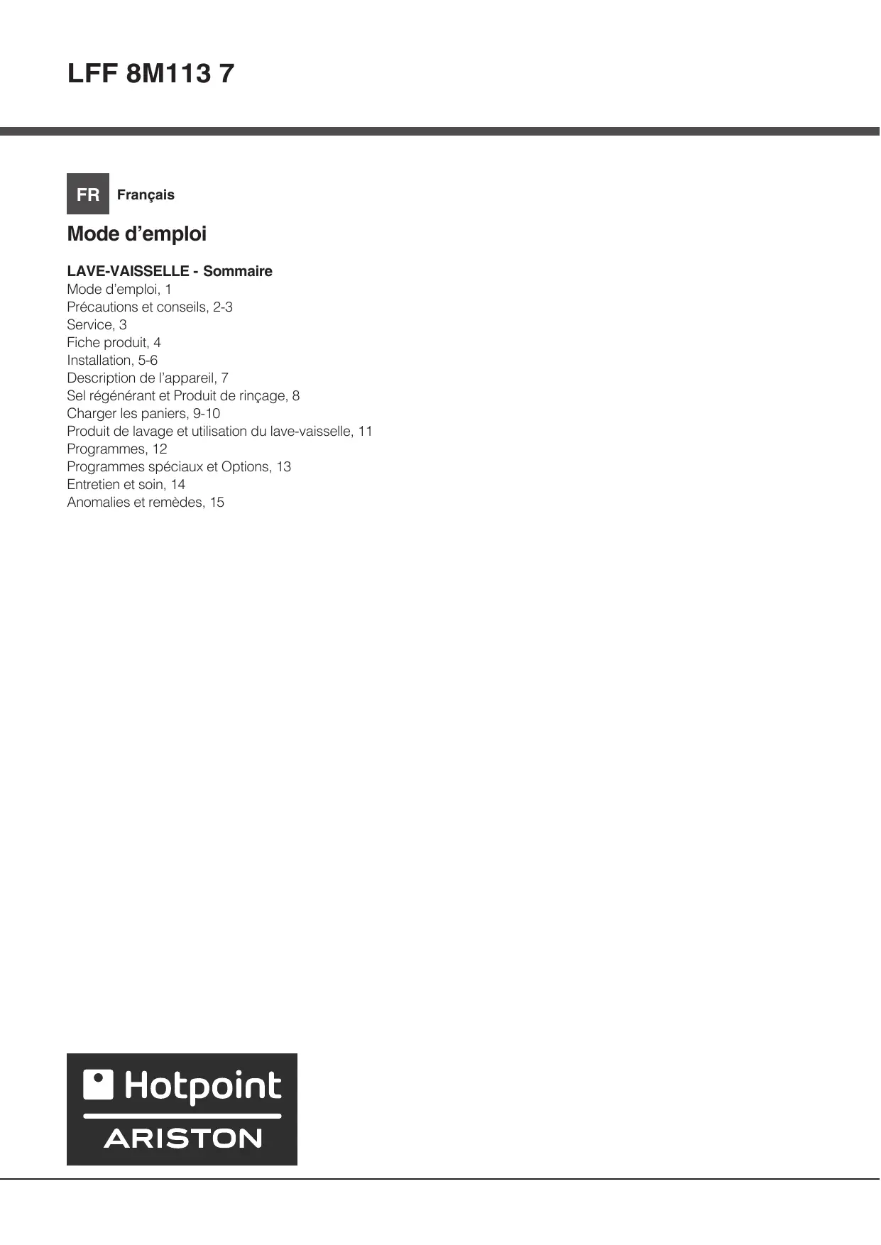 LFF 8M113 7 X EU - Lave-vaisselle HOTPOINT - Notice d'utilisation et mode d'emploi gratuit