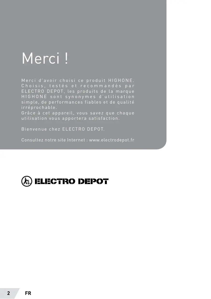 Merci | Merci d'avoir choisi ce produit HIGHONE. Choisis, testés et recommandés par ELECTRO DEPOT, les produits de La marque HIGHONE sont synonymes d'utilisation simple, de performances fiables et de qualité irréprochable Grâce à cet appareil, vous savez que chaque utilisation vous apportera satisfaction Bienvenue chez ELECTRO DEPOT. Consultez notre site Internet : www.electrodepot.fr