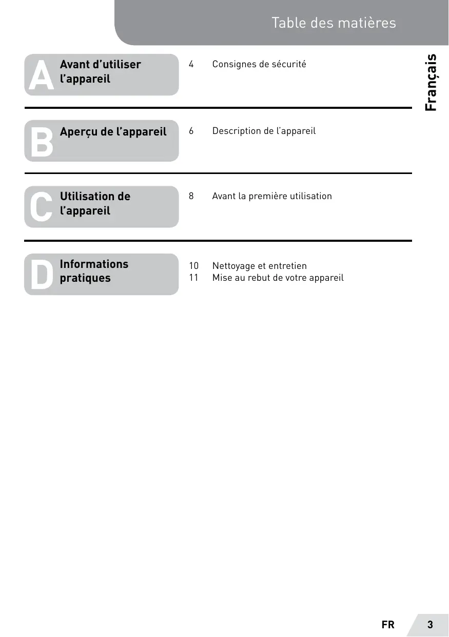 Table des matières Francais Avant d'utiliser 4 Consignes de sécurité l'appareil Aperçu de l'appareil 6 Description de l'appareil Utilisation de 8 Avant La première utilisation l'appareil Informations 10 Nettoyage et entretien pratiques 11 Mise au rebut de votre appareil FR 3