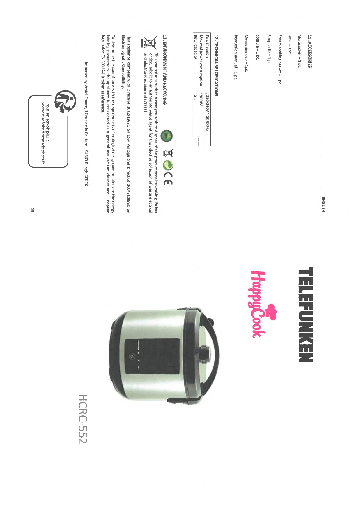 HCRC-552 - Robot cuiseur TELEFUNKEN - Notice d'utilisation et mode d'emploi gratuit