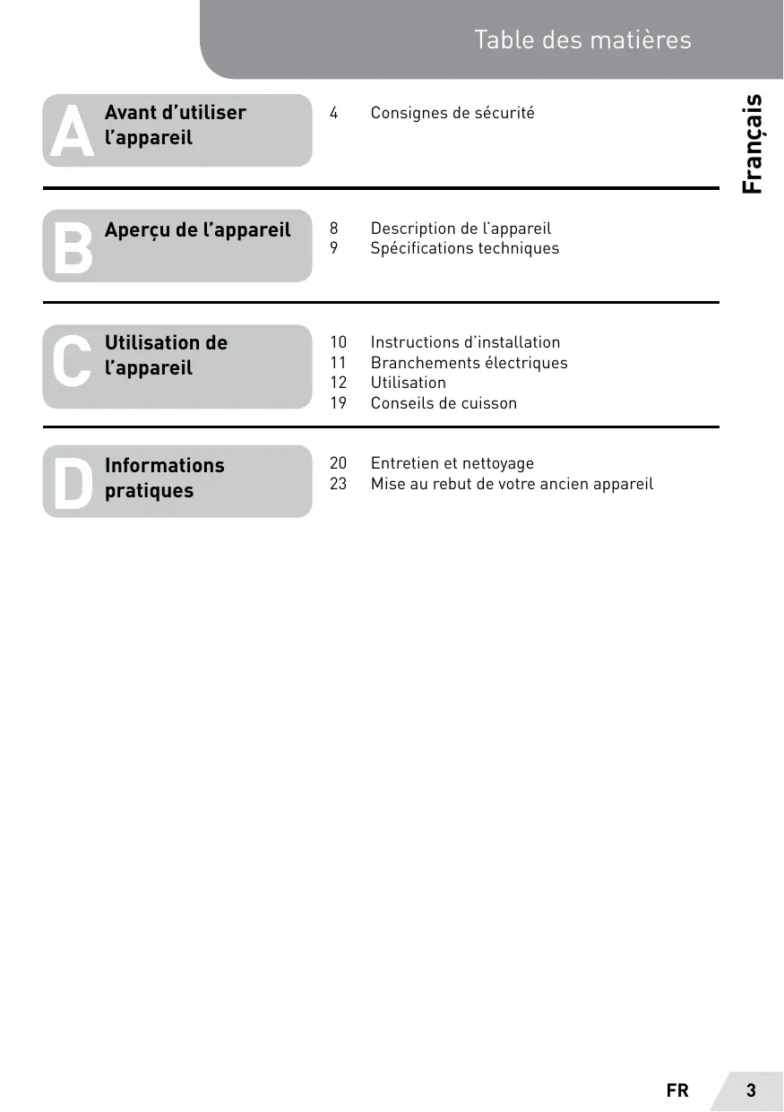 Table des matières Francais Avant d'utiliser 4 Consignes de sécurité l'appareil Aperçu de l'appareil 8 Description de l'appareil 9 Spécifications techniques Utilisation de 10 Instructions d'installation l'appareil 11 Branchements électriques PP 12 Utilisation 19 Conseils de cuisson Informations 20 Entretien et nettoyage pratiques 23 Mise au rebut de votre ancien appareil FR 3