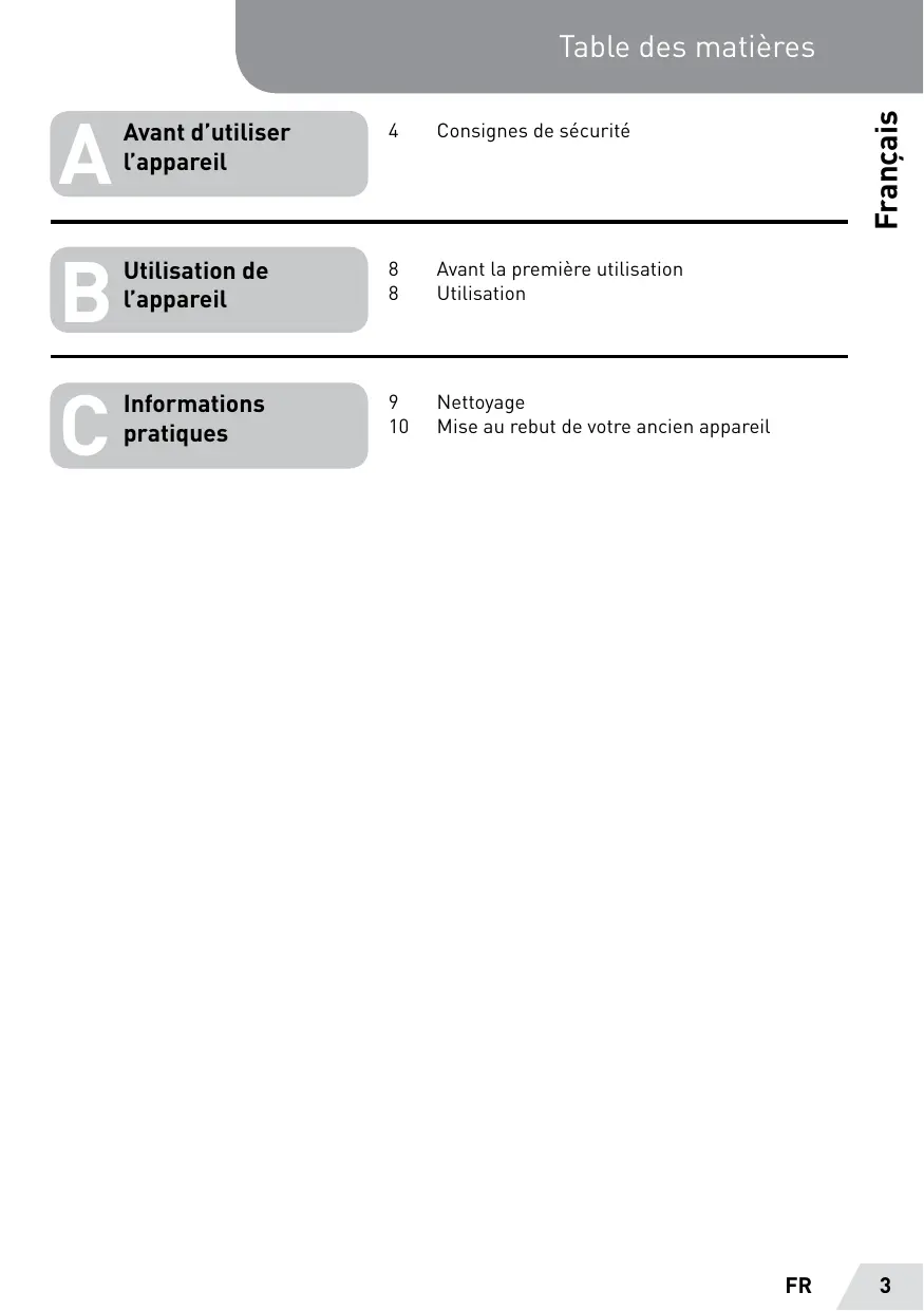 Table des matières Avant d'utiliser 4 Consignes de sécurité l'appareil Utilisation de 8 Avant la première utilisation l'appareil 8 Utilisation Informations 9 Nettoyage pratiques 10 Mise au rebut de votre ancien appareil