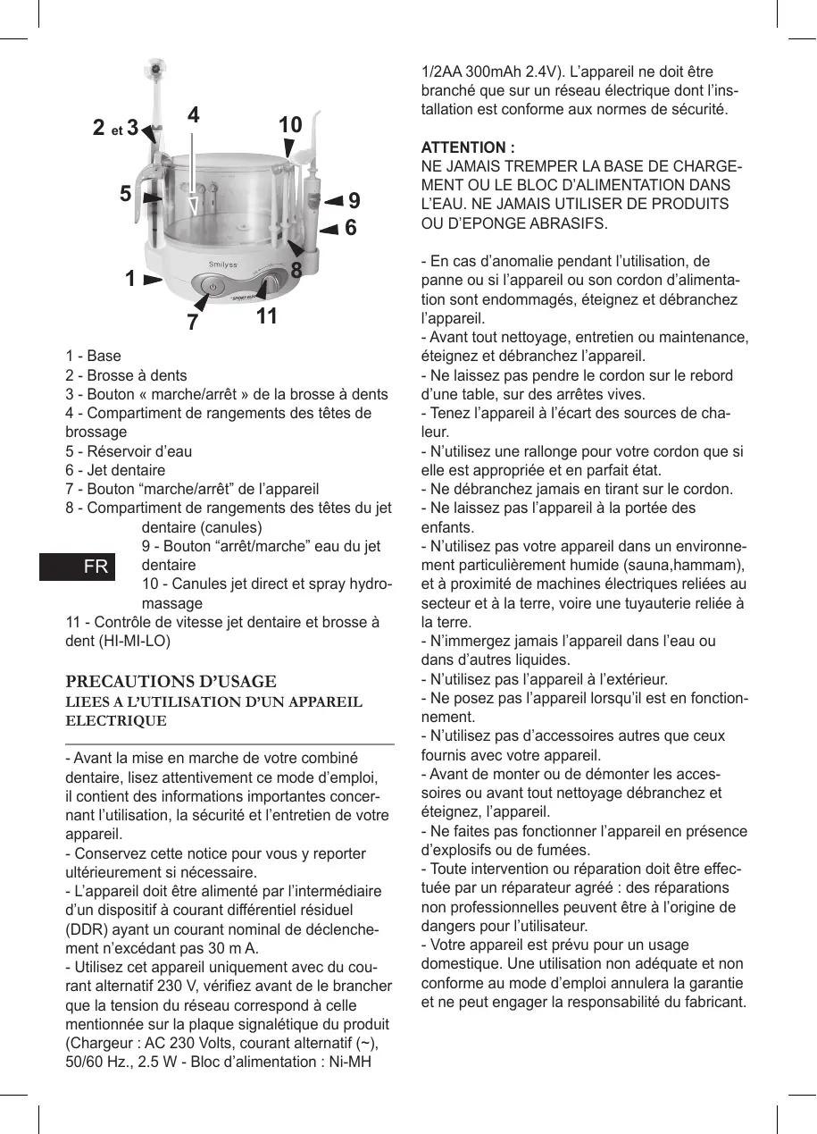 ELECTRIQUE - Avant la mise en marche de votre combiné dentaire, lisez attentivement ce mode d'emploi, il contient des informations importantes concer- nant l’utilisation, la sécurité et l'entretien de votre appareil - Conservez cette notice pour vous y reporter ultérieurement si nécessaire. - L'appareil doit être alimenté par l'intermédiaire d'un dispositif à courant différentiel résiduel (DDR) ayant un courant nominal de déclenche- ment n'excédant pas 30 m À. - Utilisez cet appareil uniquement avec du cou- rant altematif 230 V, vérifiez avant de le brancher que la tension du réseau correspond à celle mentionnée sur la plaque signalétique du produit (Chargeur : AC 230 Volts, courant alternatif (=), 50/60 Hz., 2.5 W - Bloc d'alimentation : Ni-MH 1/2AA 300mAh 2.4V). L'appareil ne doit être branché que sur un réseau électrique dont l'ins- tallation est conforme aux normes de sécurité. ATTENTION : NE JAMAIS TREMPER LA BASE DE CHARGE-