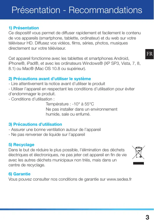 Recyclage Déchets d'équipements électriques et électroniques Ce symbole sure produit, ses accessoires ou sa documentation indique que ce dernier est conforme à la Directive européenne 2012/19/UE. Cela signifie que rie produit, ni ses accessoires électroniques usagés ne peuvent être jetés avec les autres déchets ménagers. Veullez séparer vos produits et accessoires usagés des autres déchels. La mise au rebui choyenne de voir ancien produit permet de protéger l'environnement et la santé, vous favoriserez ainsi le recyclage de la matière qui les compose dans le cadre d'un développement durable: Les paricuiers sont invités à contacter les autorités locales pour connaitre les procédures etles points de colectes de ces produits en vue de leur recyclage. î Pour en savoir plus vw quefairedemescechets fr Garantie La garantie de votre appareil et ses accessoires se conforme aux dispositions légales A la date de l'achat. Les pièces détachées pour cet appareil sont au moins disponibles pendant toutes la durée de la garanti. Déclaration de conformité Par la présente, SEDEA déclare que cet apparel est conforme aux C € exigences essentiels et aux autres dispositions pertinentes des directives européennes en vigueur. La déclaration de conformité peut être consultée sur le site : wamw.sedea.fr. Contacts Emal : clent@sedea.fr Site internet : ww. sedea fr