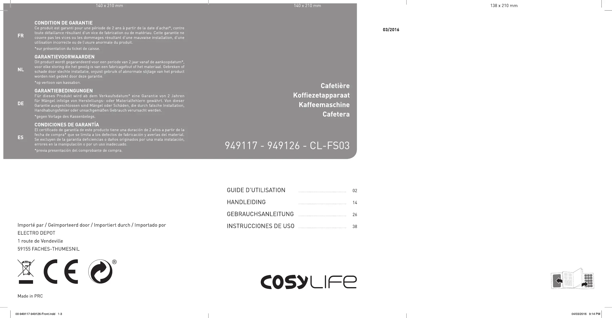Merci | Merci d'avoir choisi ce produit COSYLIFE. Choisis, testés et recommandés par ELECTRO DEPOT, les produits de La marque COSYLIFE vous assurent une utilisation simple, une performance fiable et une qualité irréprochable. Grâce à cet appareil, vous savez que chaque utilisation vous apportera satisfaction. Bienvenue chez ELECTRO DEPOT. Visitez notre site Internet : www.electrodepot.fr >TRO DEPOT Size: 140 x 210 mm 2 FR 4917-9491 26-IM-Coffee Maker-V02-160804 (Mult).indb 2 04/08/2016 9:14 PM