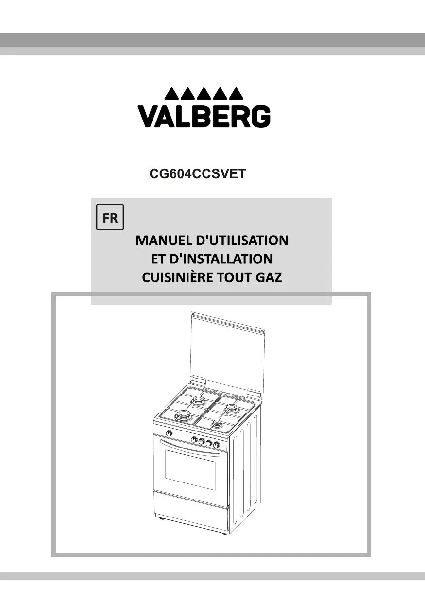 AAAAA VALBERG CG604CCSVET FR MANUEL D'UTILISATION ET D'INSTALLATION CUISINIÈRE TOUT GAZ Avant de commencer à utiliser votre nouvelle cuisinière, nous vous suggérons de lire attentivement cette notice, car elle contient tous les renseignements de base pour une installation correcte et fiable, une bonne utilisation et un entretien régulier de votre cuisinière. Cette cuisinière doit être installée uniquement par un professionnel qualifié conformément aux normes de sécurité et aux lois en vigueur. N'essayez jamais de réparer votre cuisinière vous-même.