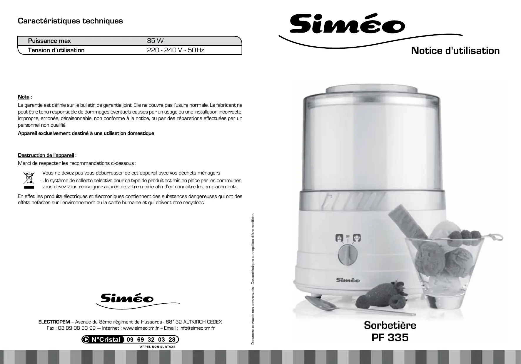 PF335 - Sorbetière SIMEO - Notice d'utilisation et mode d'emploi gratuit