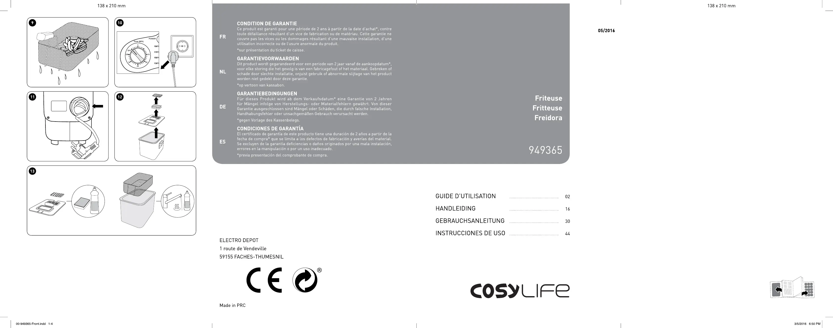 Merci ! Merci d'avoir choisi ce produit COSYLIFE. Choisis, testés et recommandés par ELECTRO DEPOT, Les produits de La marque COSYLIFE vous assurent une utilisation simple, une performance fiable et une qualité irréprochable. Grâce à cet appareil, vous savez que chaque utilisation vous apportera satisfaction. Bienvenue chez ELECTRO DEPOT. Visitez notre site Internet : www.electrodepot.fr TRO DEPOT Size: 140 x 210 mm 2 FR 48865-IM-DeepFryer-VO1-160502 (Multi. indb 2 52016 6:52 PM