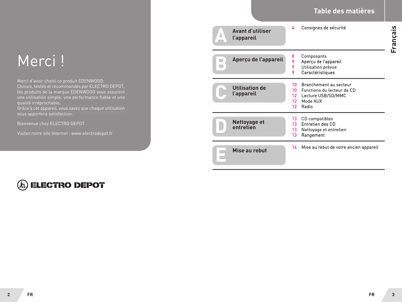 Merci | Merci d'avoir choisi ce produit EDENWOOD. Choisis, testés et recommandés par ELECTRO DEPOT, les produits de la marque EDENWOOD vous assurent une utilisation simple, une performance fiable et une qualité irréprochable. Grâce à cet appareil, vous savez que chaque utilisation vous apportera satisfaction. Bienvenue chez ELECTRO DEPOT. Visitez notre site Internet : www.electrodepot.fr TRO DEPOT