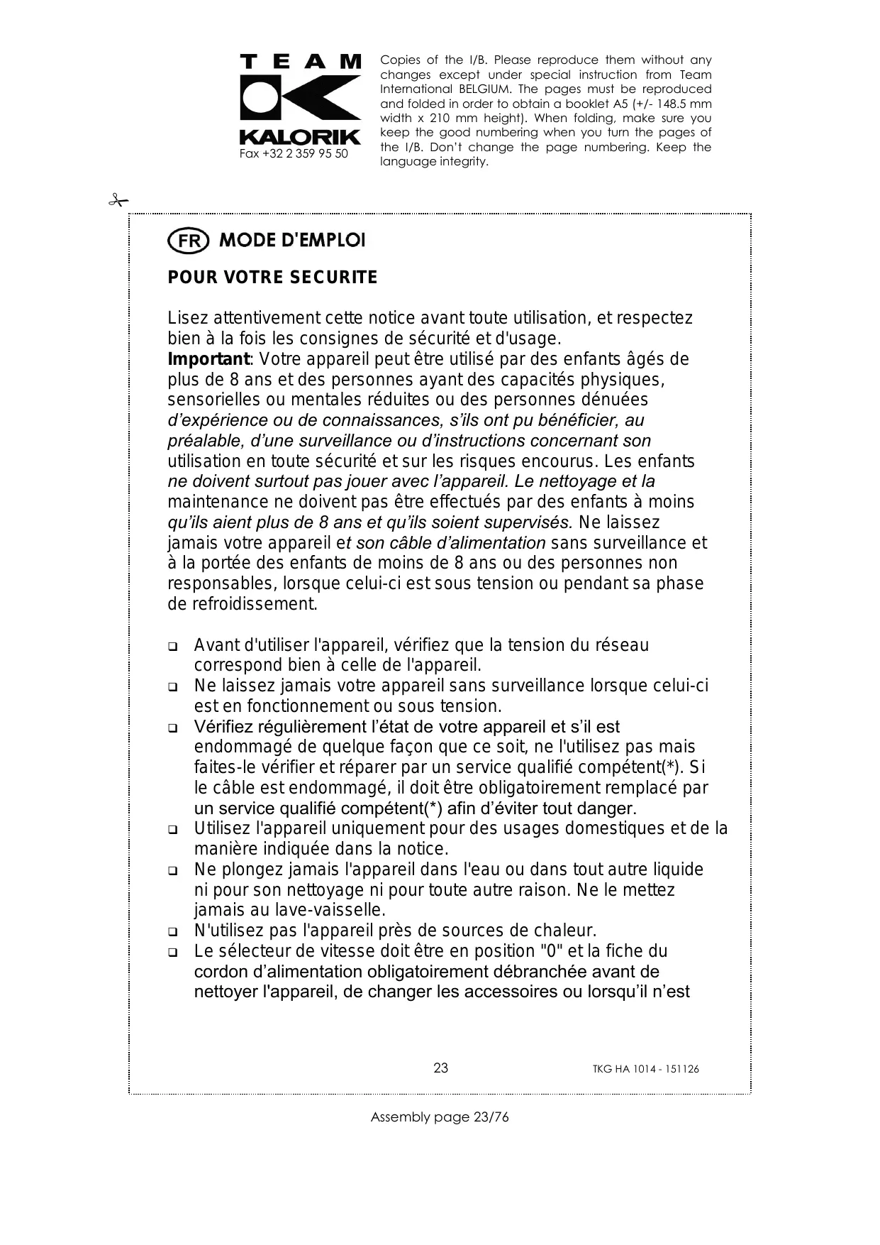 MODE D'EMPLOI HA 1014S TEAM KALORIK